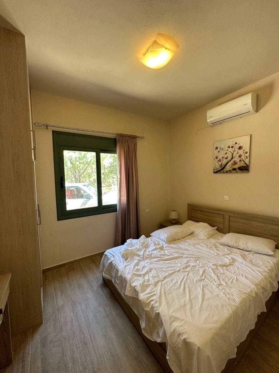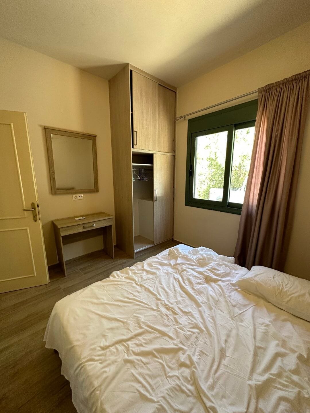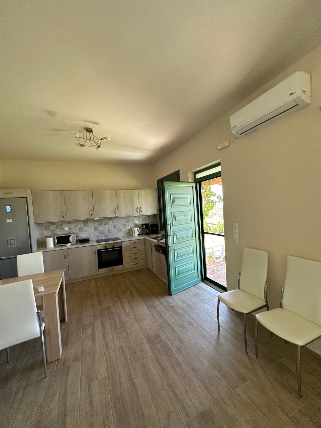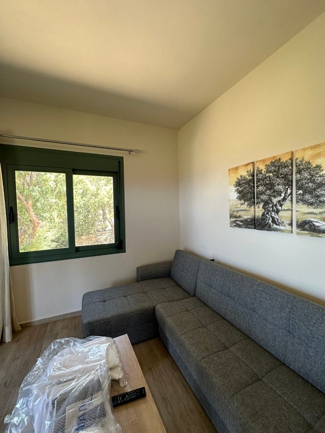 A house with a total surface area of 75 square meters is available for monthly rent in the Triopetra area. The house features a spacious open-plan living room and kitchen with a dining area that is fully furnished and equipped with electrical appliances. It comprises of two bedrooms with fitted wardrobes – one featuring a double bed and the other, two single beds – both equipped with large windows for natural light. The house also has a spacious bathroom with a shower and washing machine.