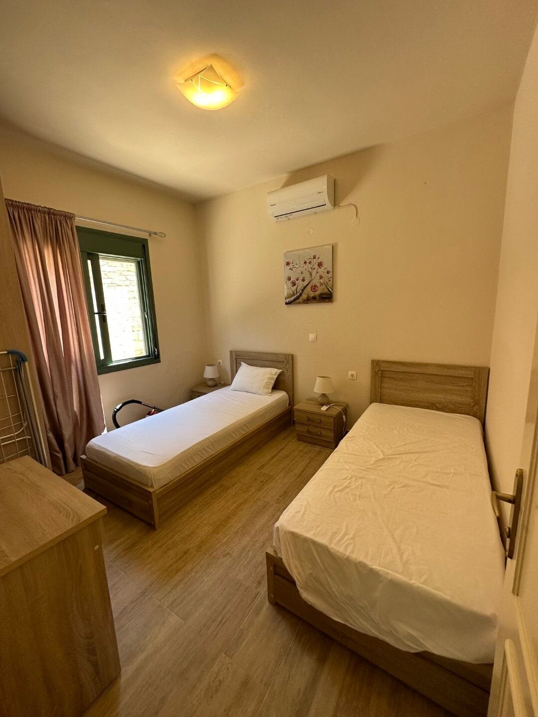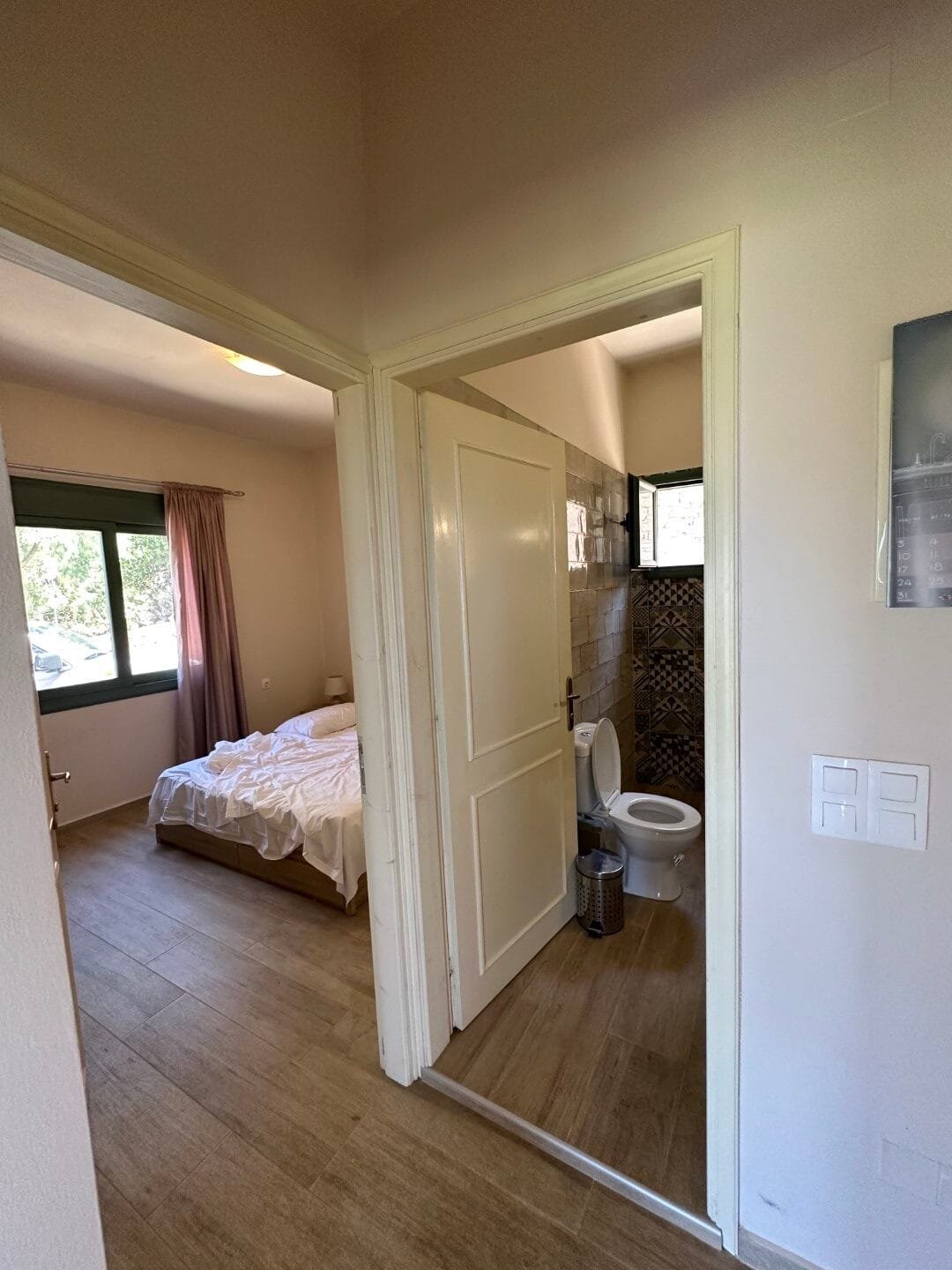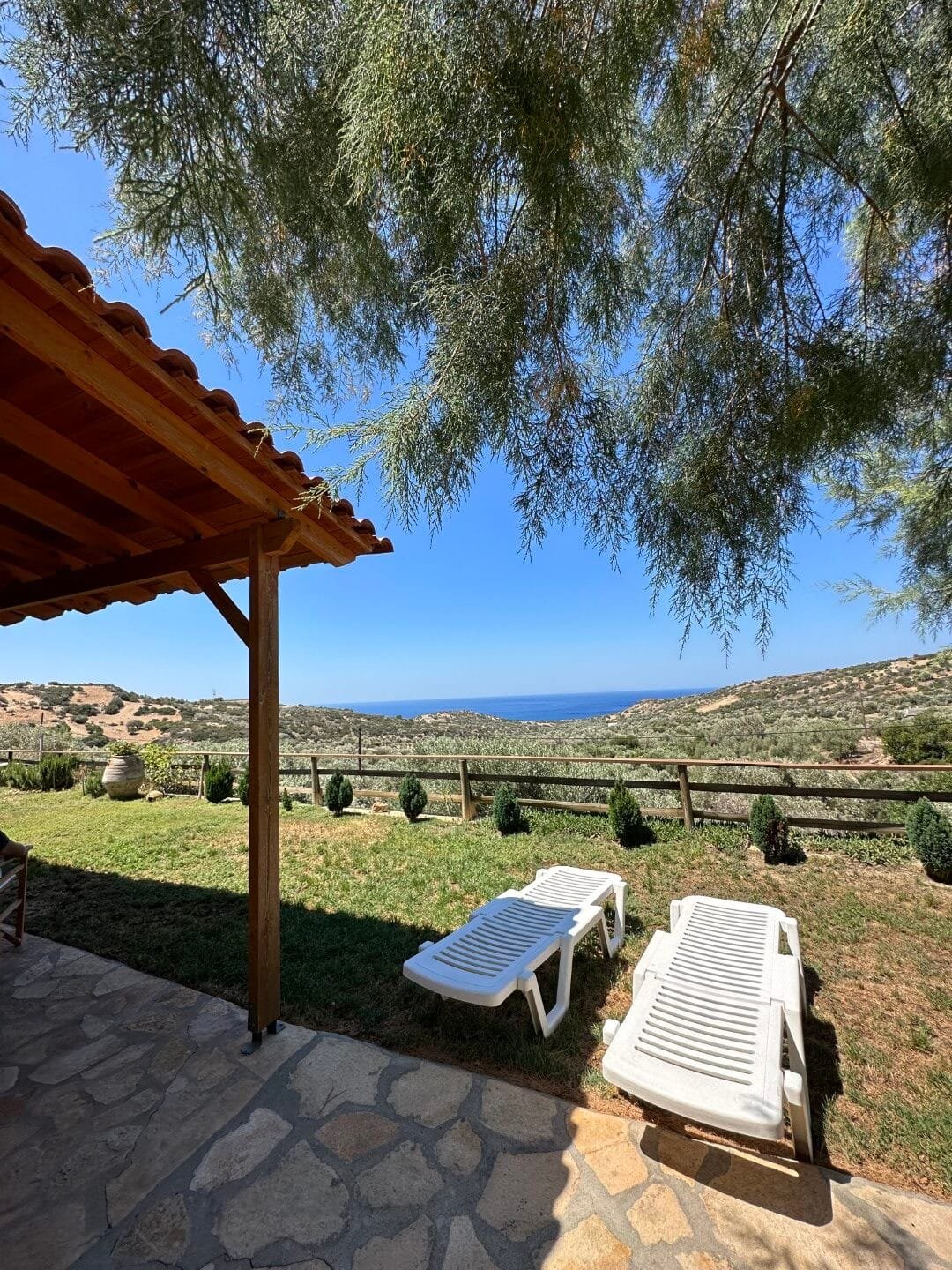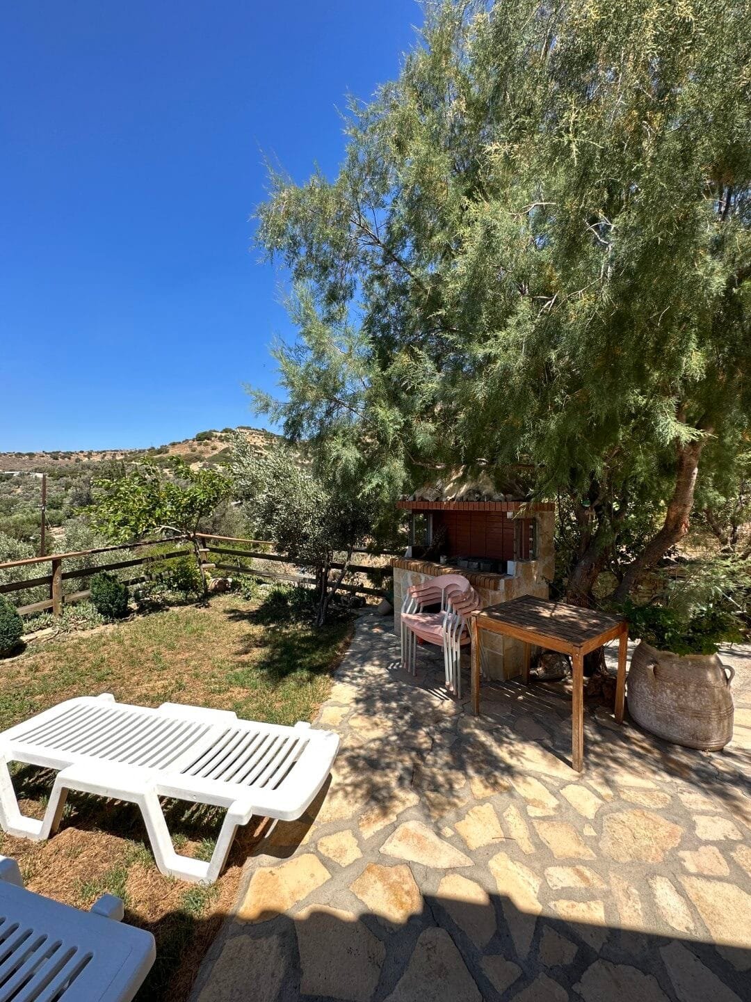 A house with a total surface area of 75 square meters is available for monthly rent in the Triopetra area. The house features a spacious open-plan living room and kitchen with a dining area that is fully furnished and equipped with electrical appliances. It comprises of two bedrooms with fitted wardrobes – one featuring a double bed and the other, two single beds – both equipped with large windows for natural light. The house also has a spacious bathroom with a shower and washing machine.