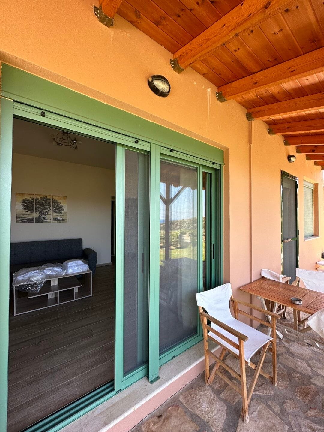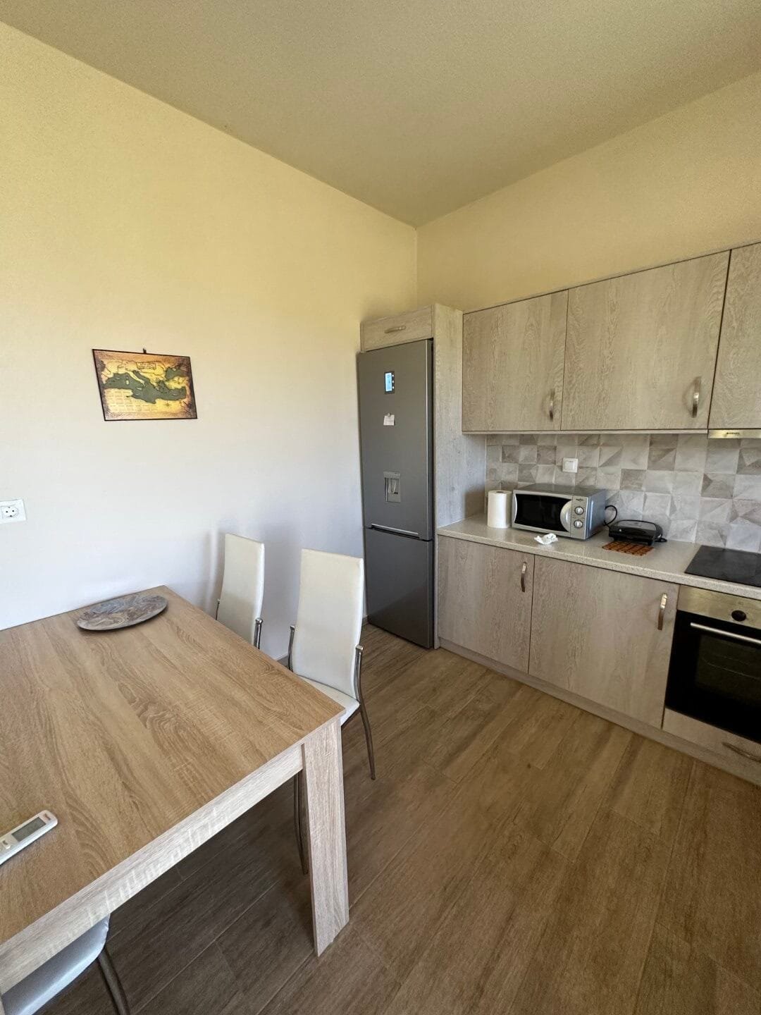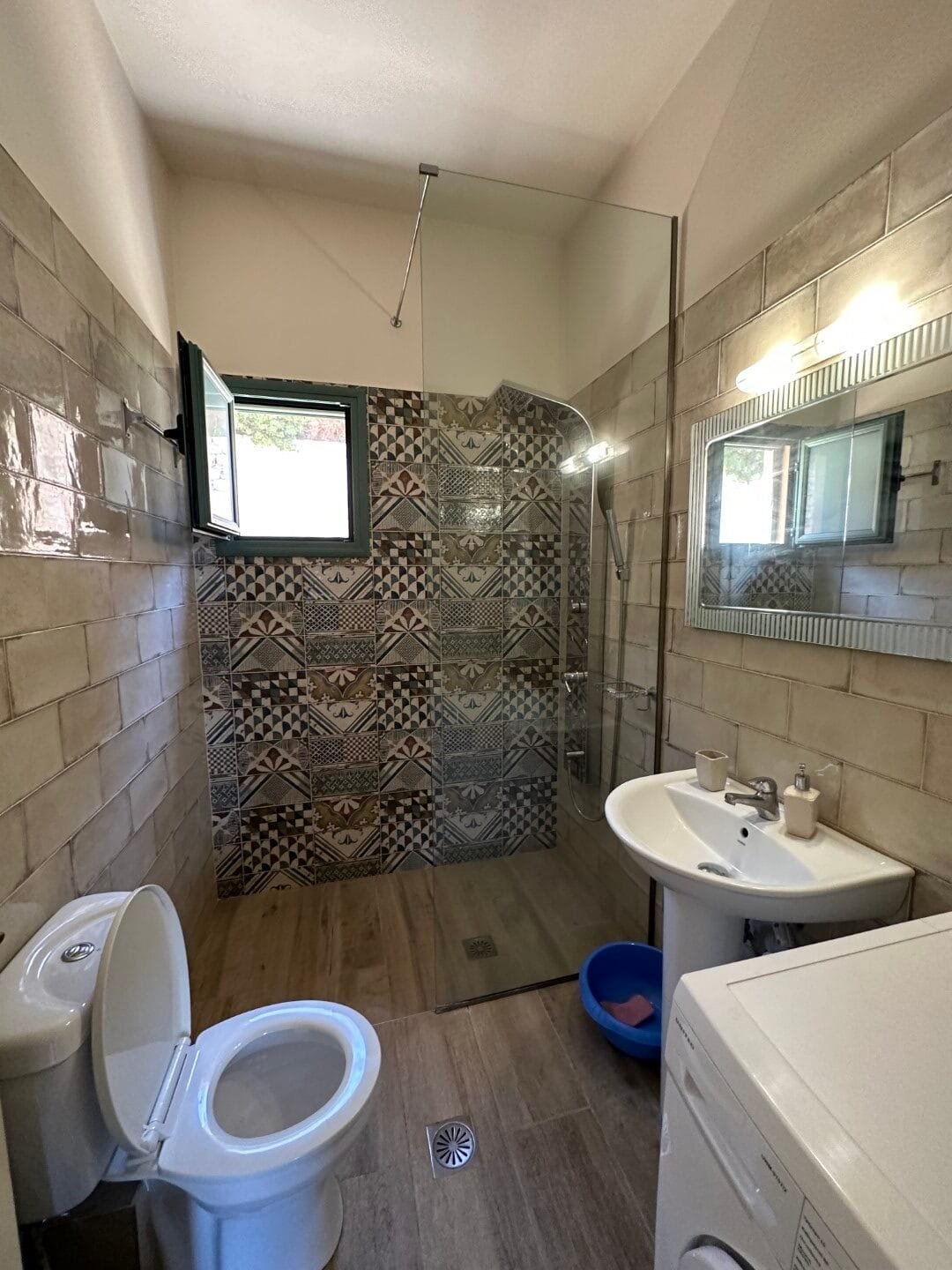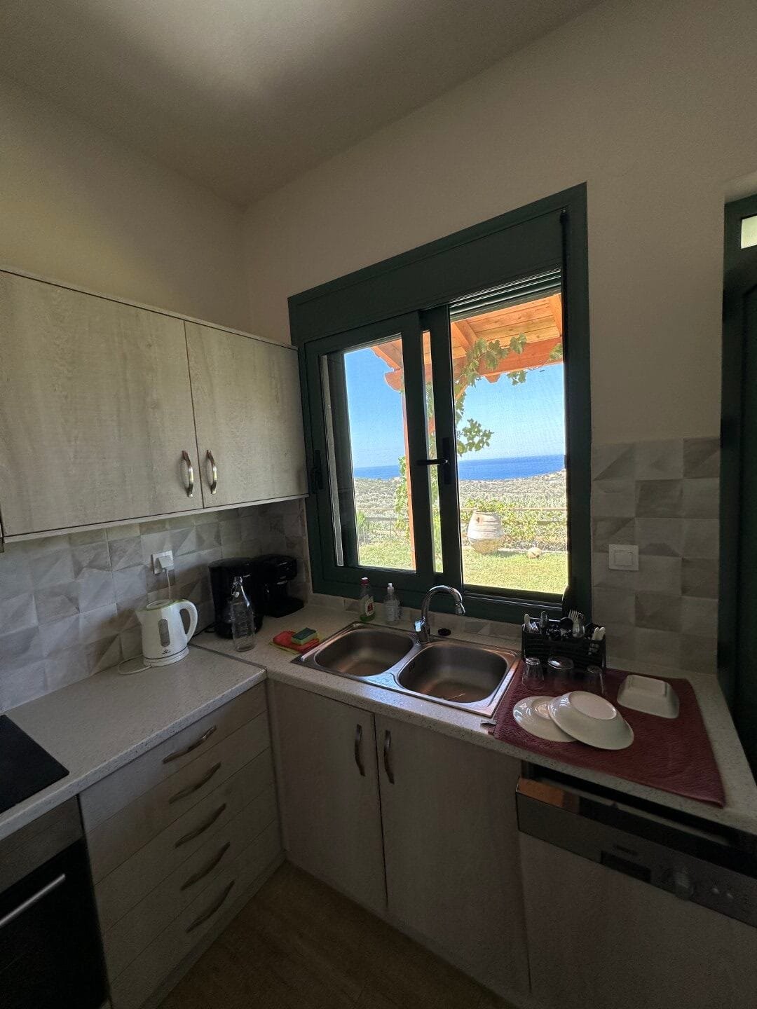 A house with a total surface area of 75 square meters is available for monthly rent in the Triopetra area. The house features a spacious open-plan living room and kitchen with a dining area that is fully furnished and equipped with electrical appliances. It comprises of two bedrooms with fitted wardrobes – one featuring a double bed and the other, two single beds – both equipped with large windows for natural light. The house also has a spacious bathroom with a shower and washing machine.