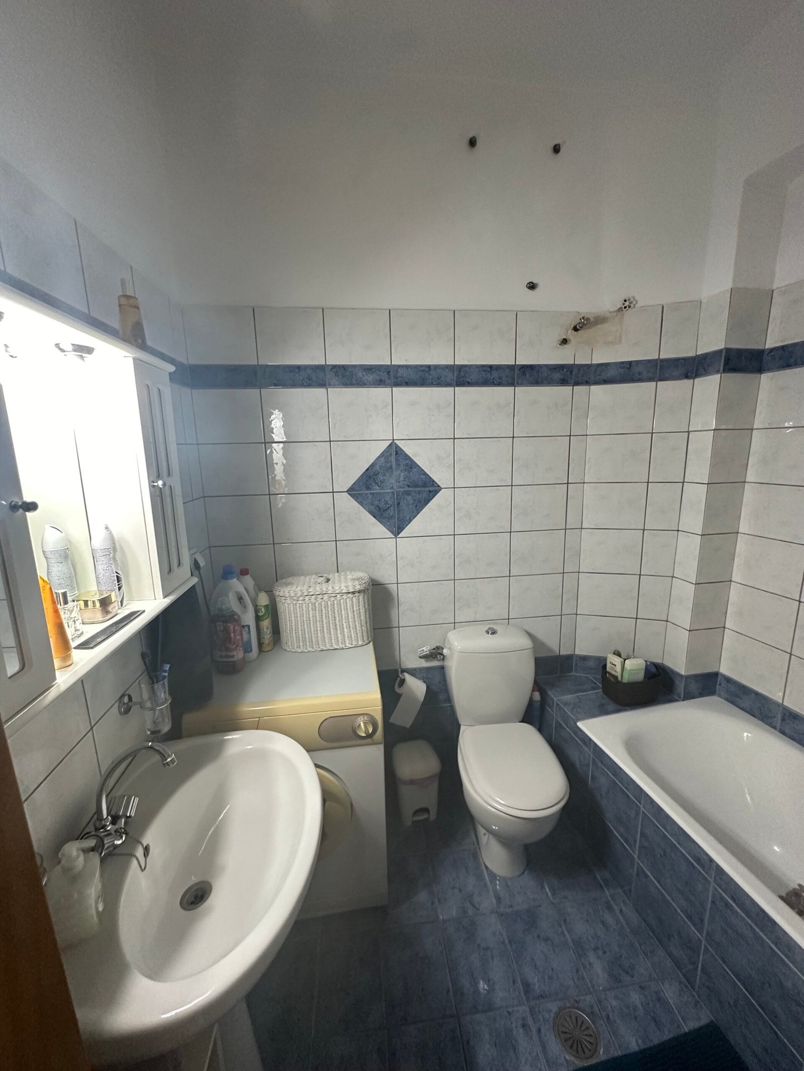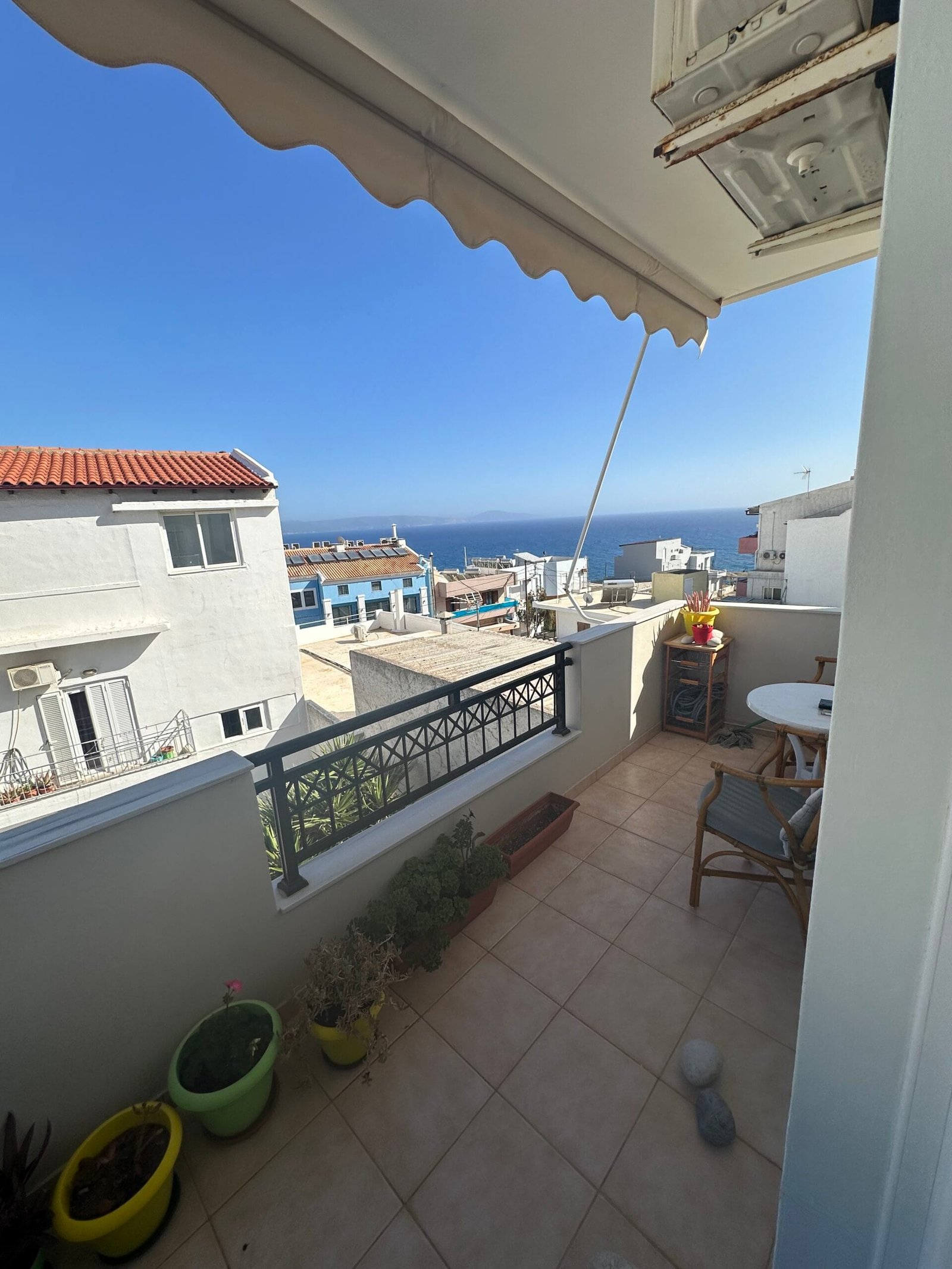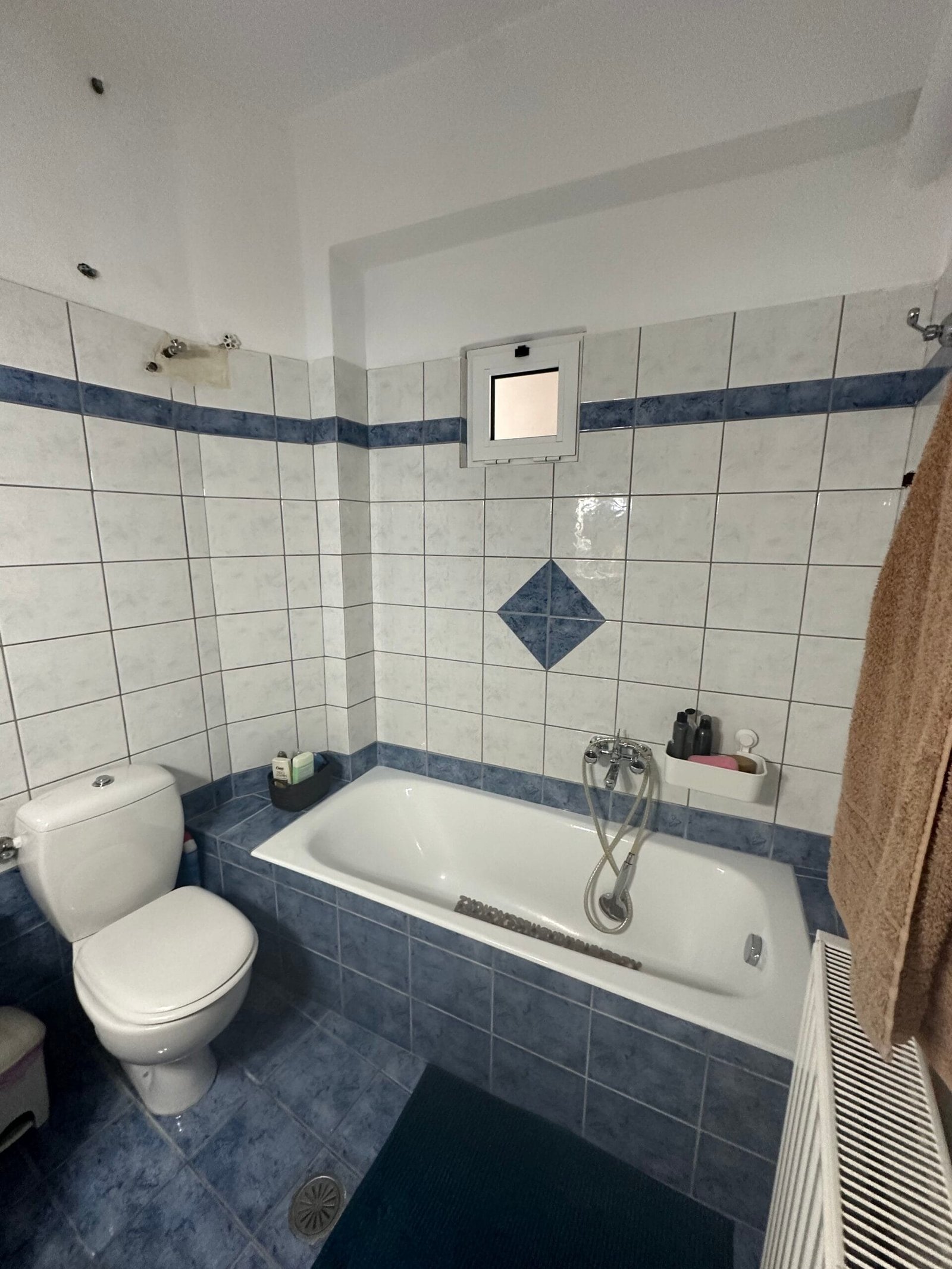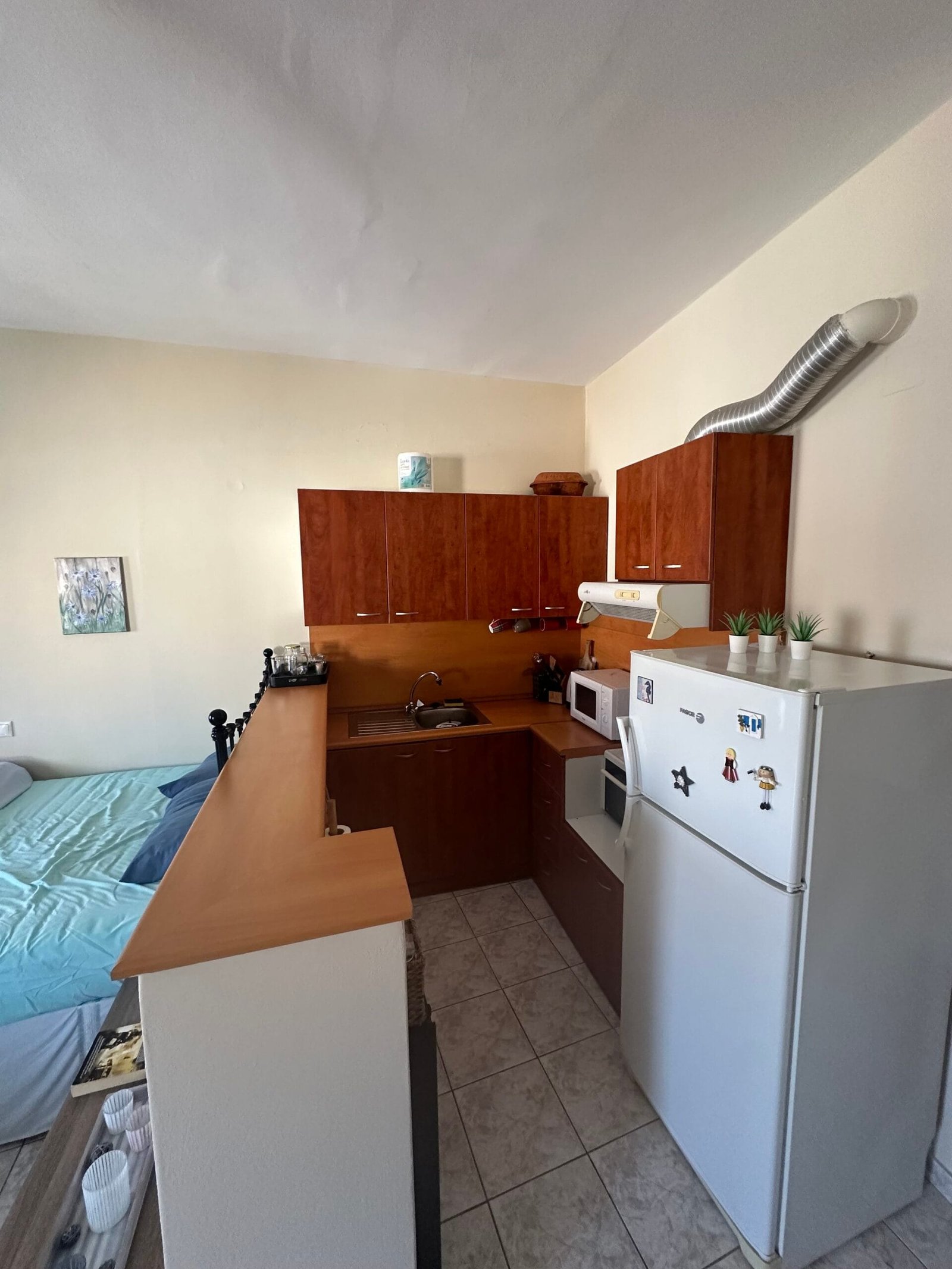 A fully furnished one-room apartment with a total surface of 45 square meters is available for rent. The kitchen is equipped with electrical appliances, there is a double bed, a small living room and a spacious bathroom with bathtub. The apartment is situated on the second floor and features a balcony with a view of the sea. It will be available starting in May.