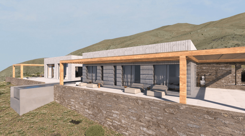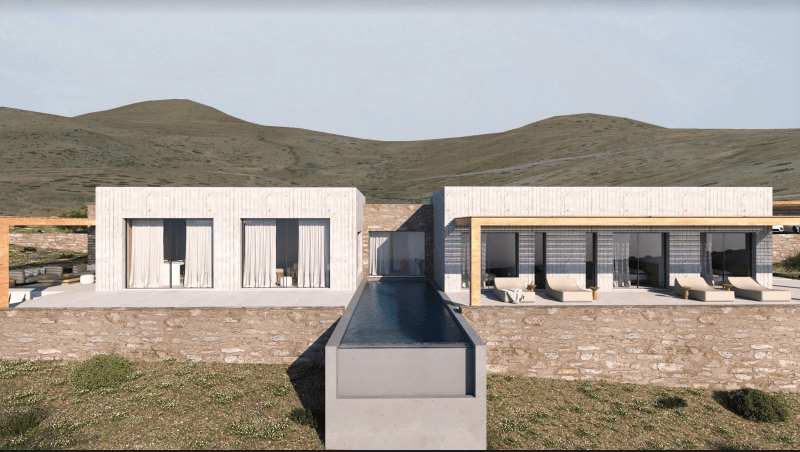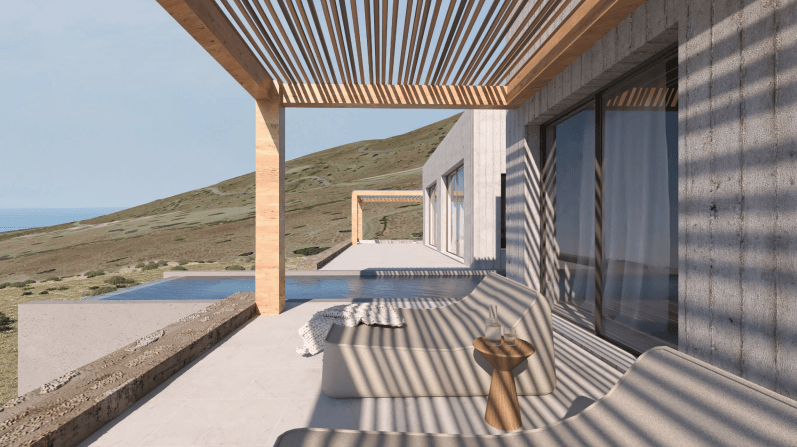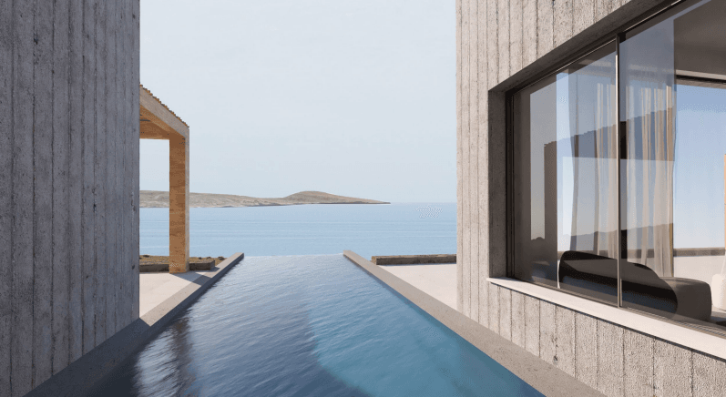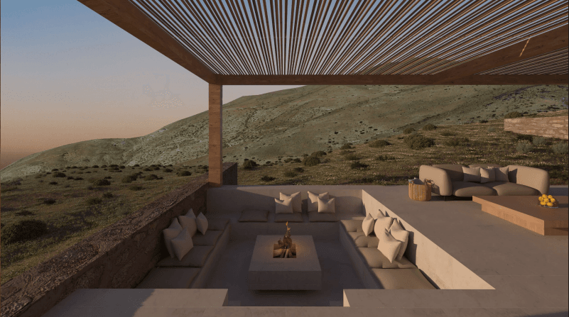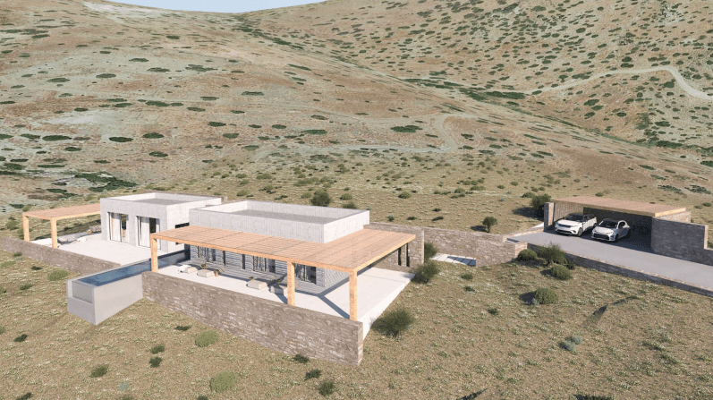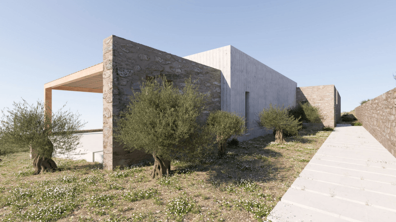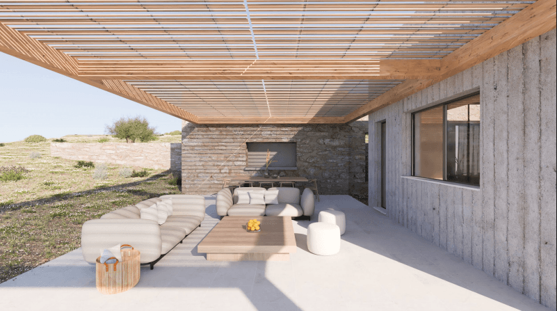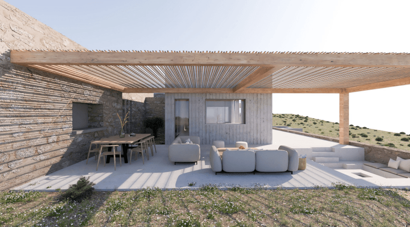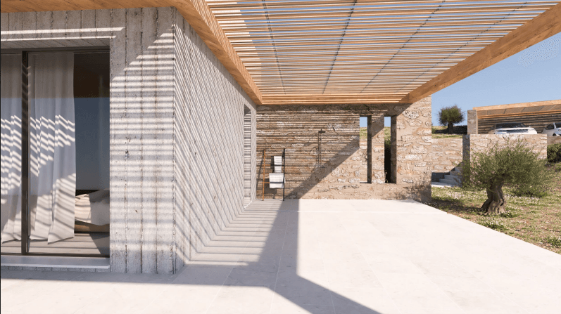 The residence is located in the southern part of Rethymno on a slope, with an unobstructed view of the Libyan sea and the Paximadia islands. The composition of 165 sq.m. consists of exposed concrete volumes alternating with stone elements such as the entrance volume and the free-standing walls. The structure is completed by pergolas on the East, South and West sides, forming patios that function as quiet places to enjoy the view and the outdoors and as well as meeting points for all the tenants.
