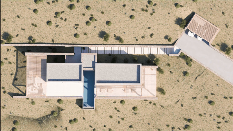 The composition is broken up by the water volume – the pool – which faces the view and separates the house into public and more private uses.