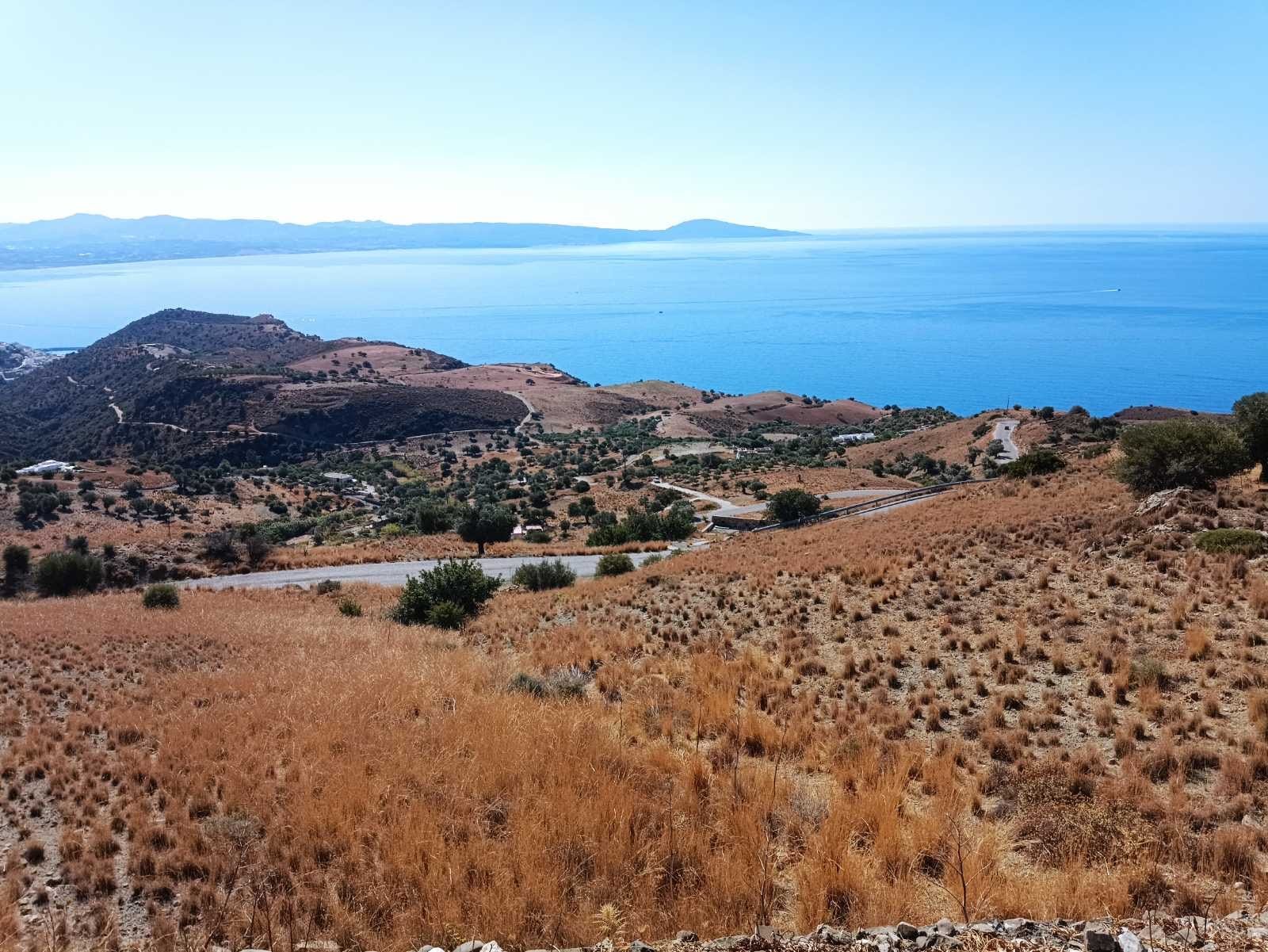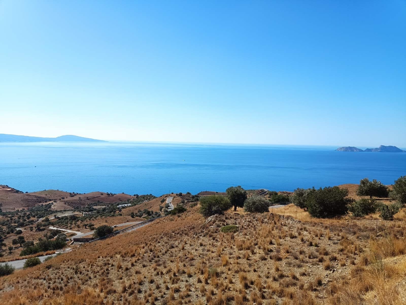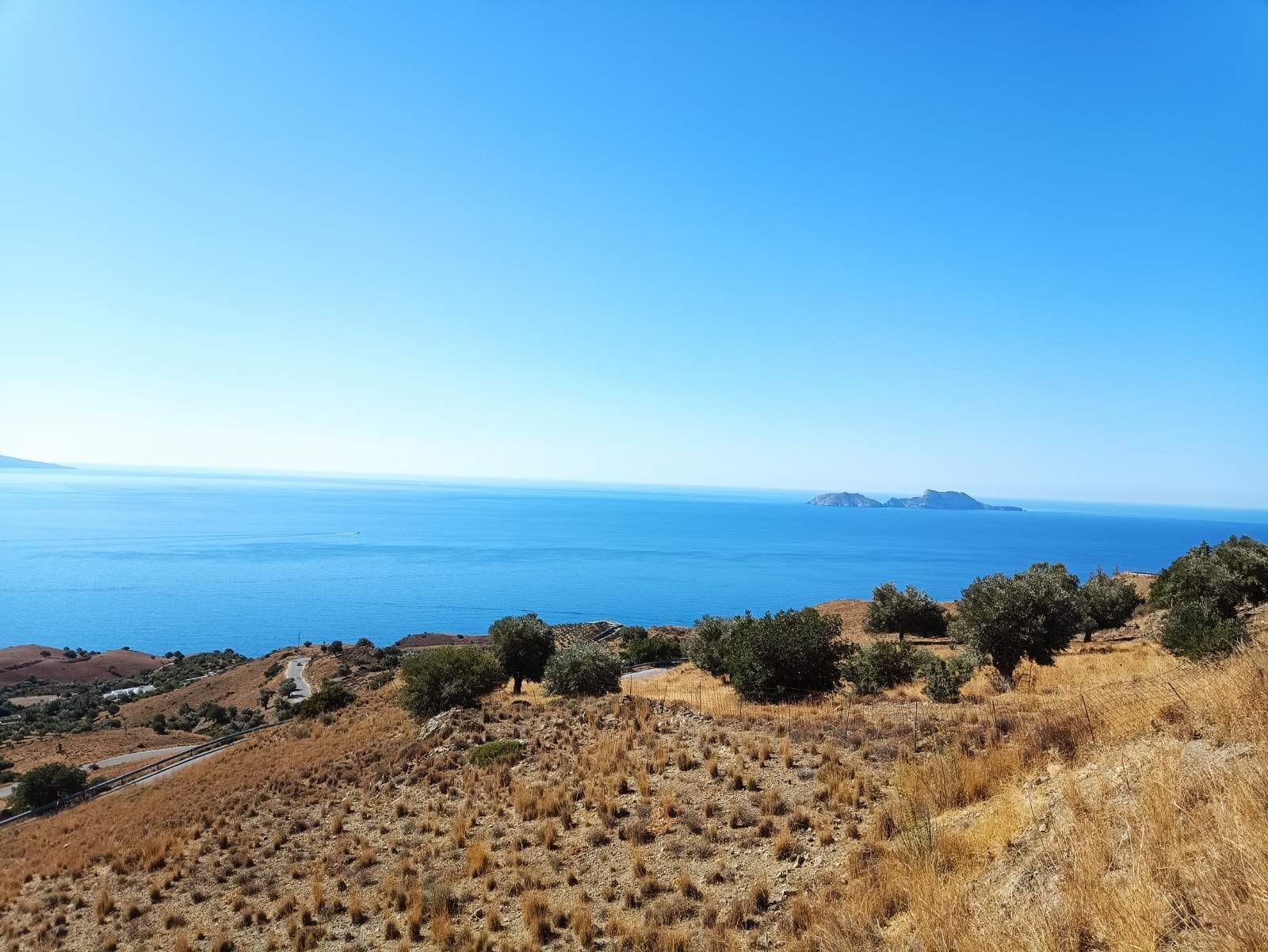 A 4,161.83 square meter plot, which is buildable, is available for sale. It is located next to the provincial road and has water and electricity connections around 200 meters away. The plot offers panoramic views of the sea and the surrounding mountain peaks.