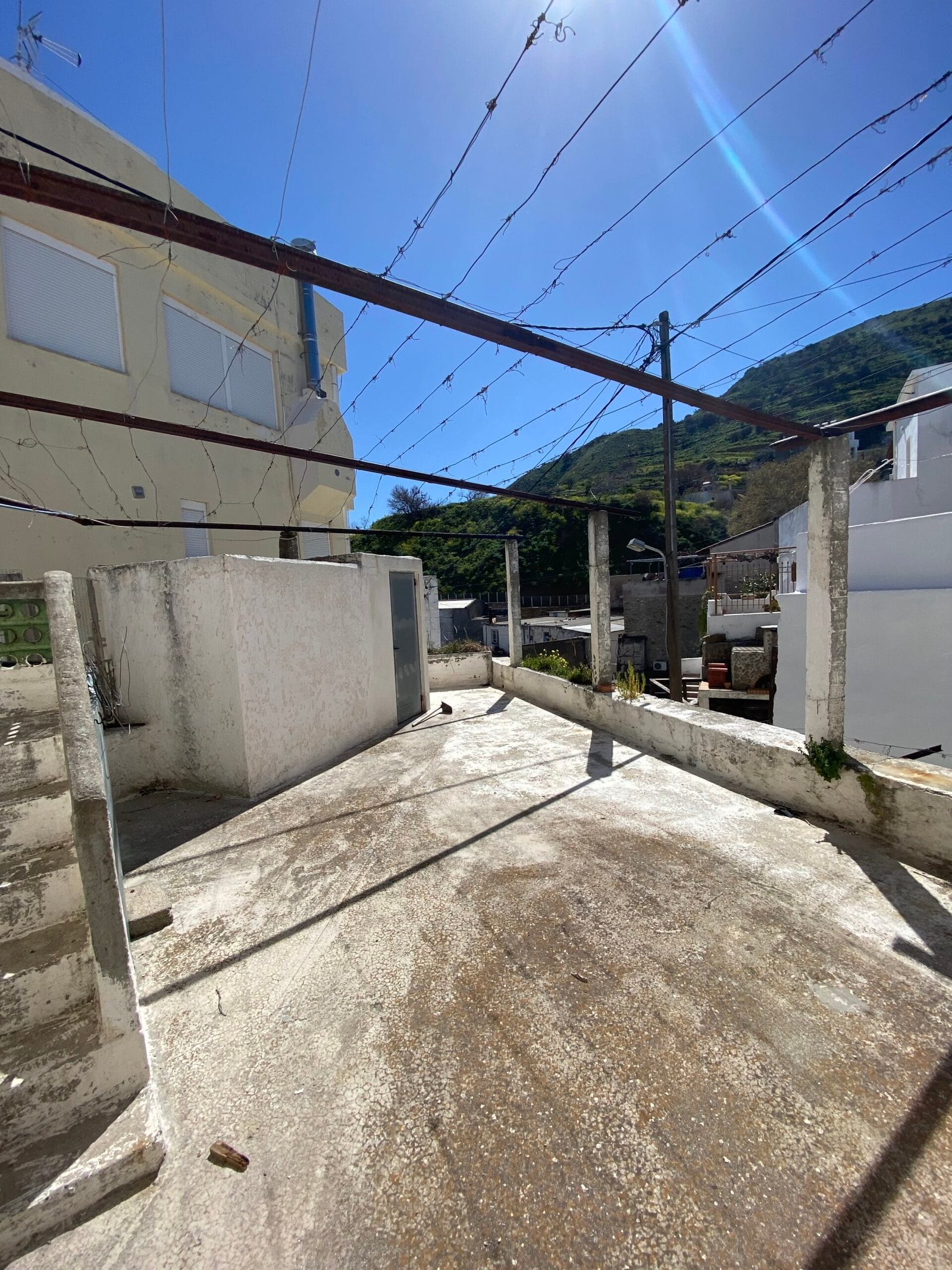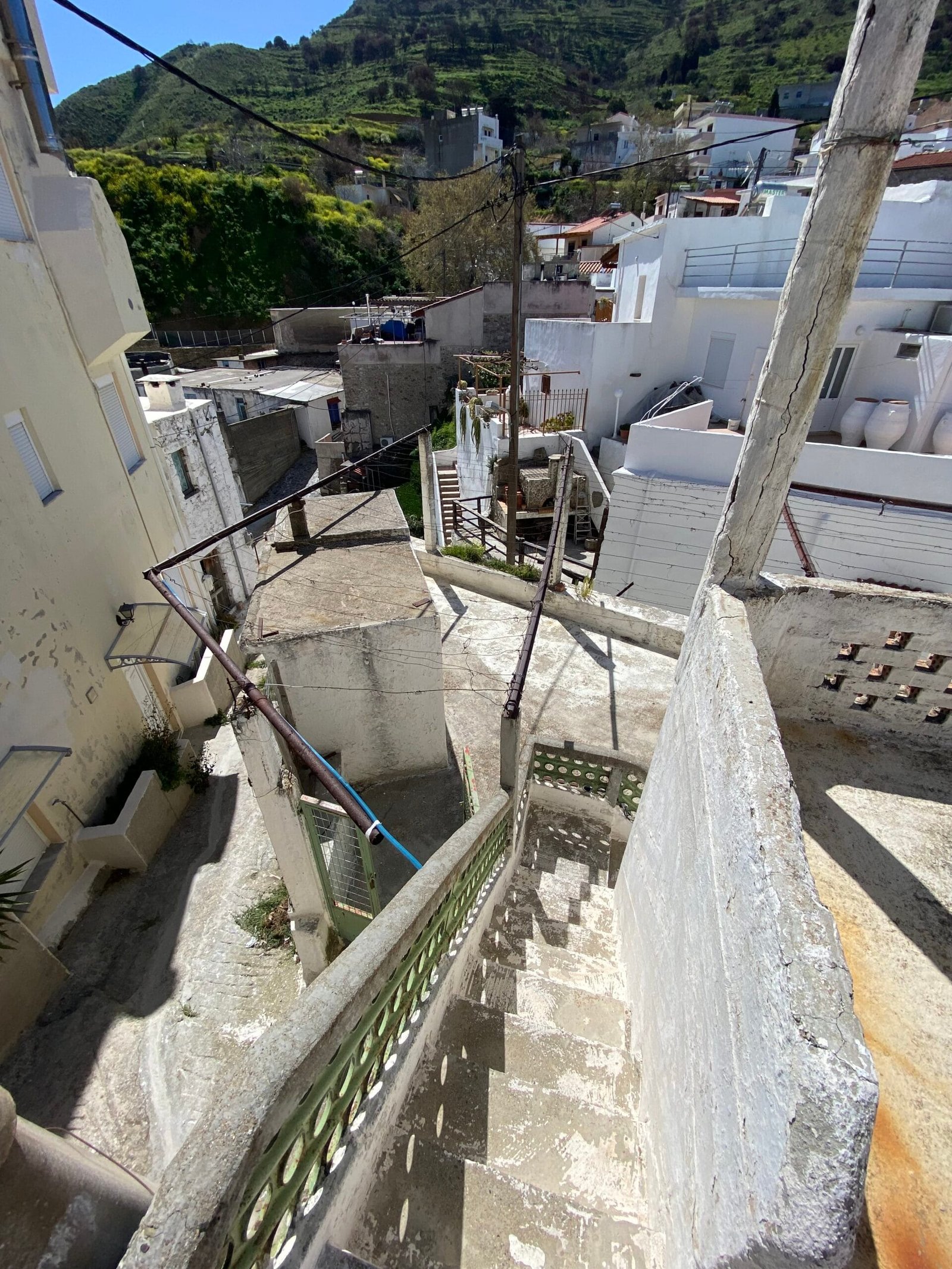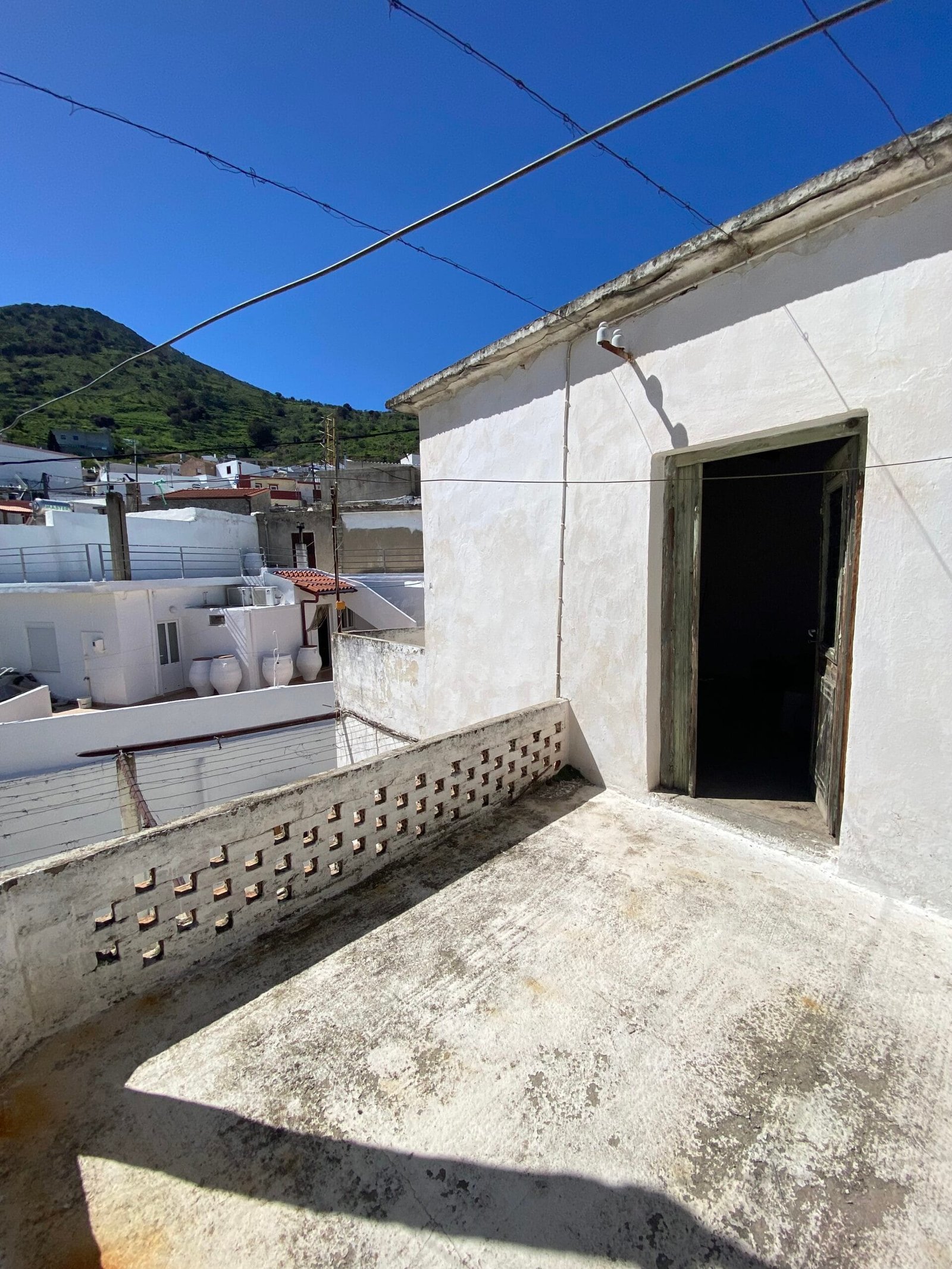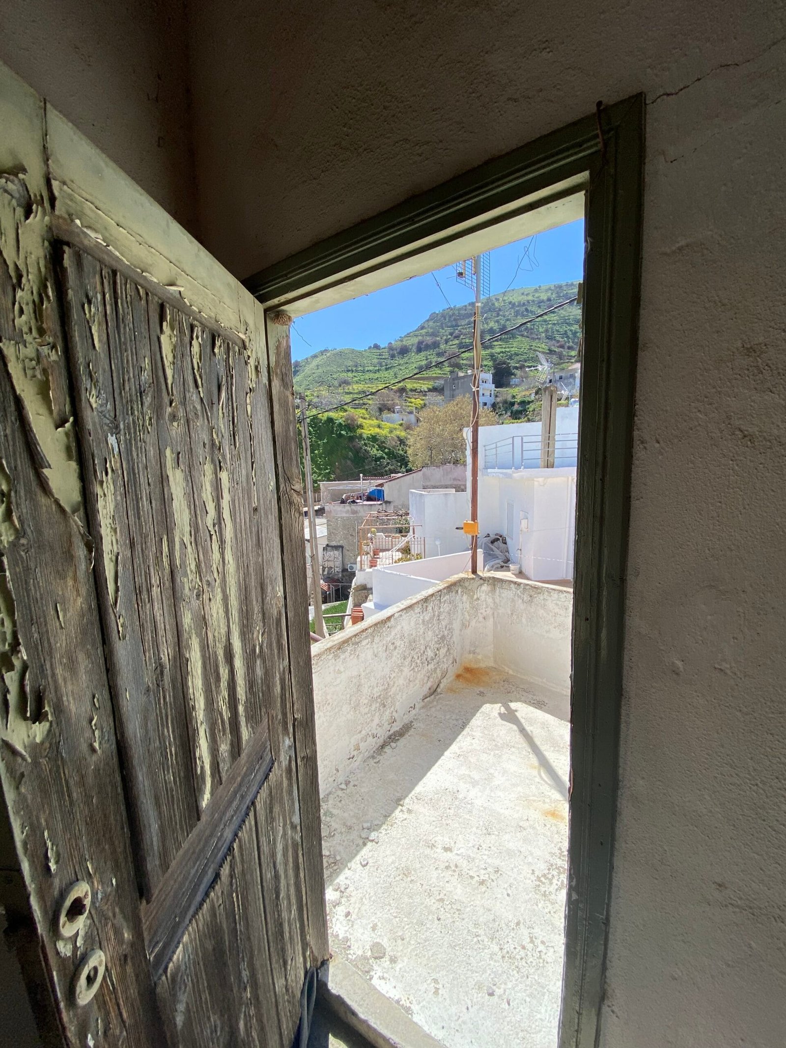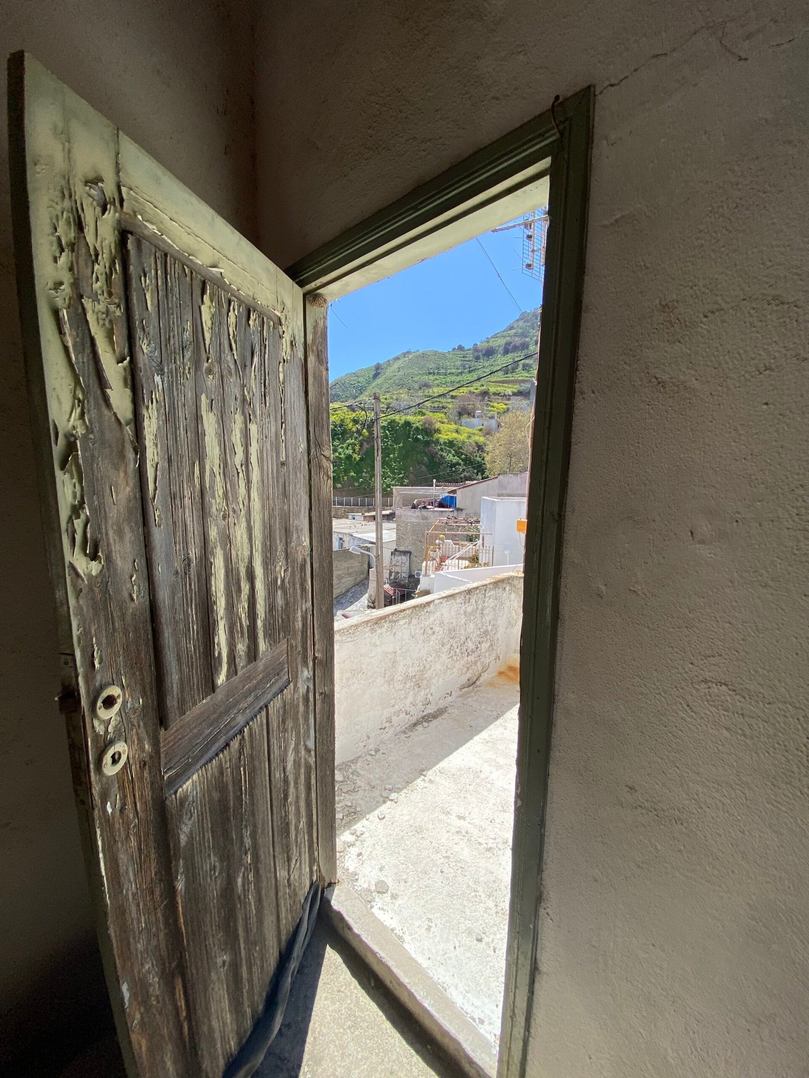 This three-story building is divided into two houses and requires complete renovation. The total area is approximately 100 square meters. Outside, there is a small terrace at the rear facing the village lanes and another at the front access via stairs to the entrance door. The property also features a balcony with a view of the opposite hillside and the surrounding houses.