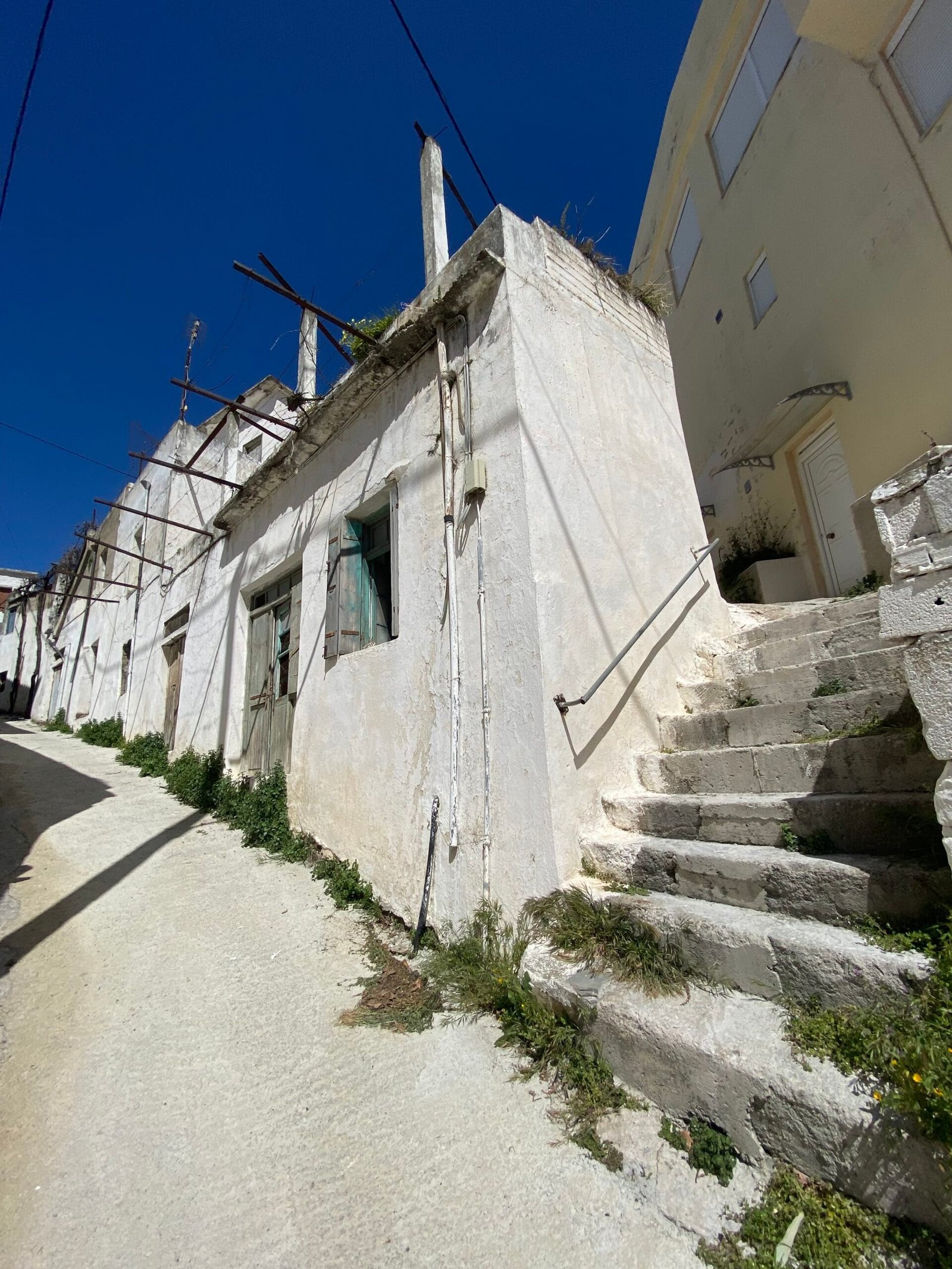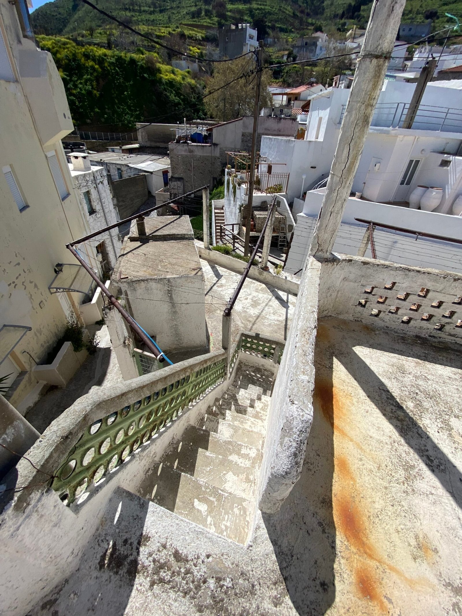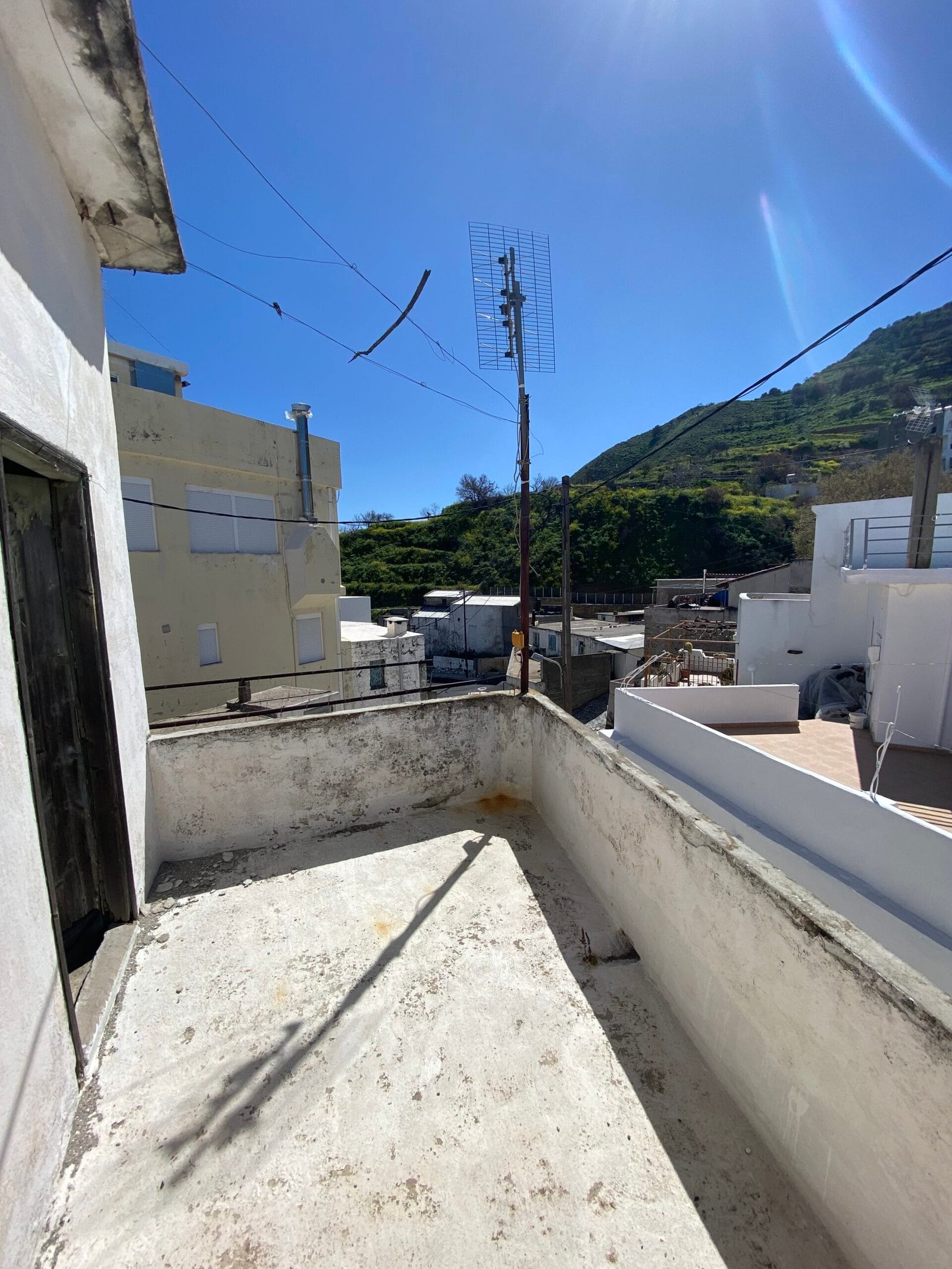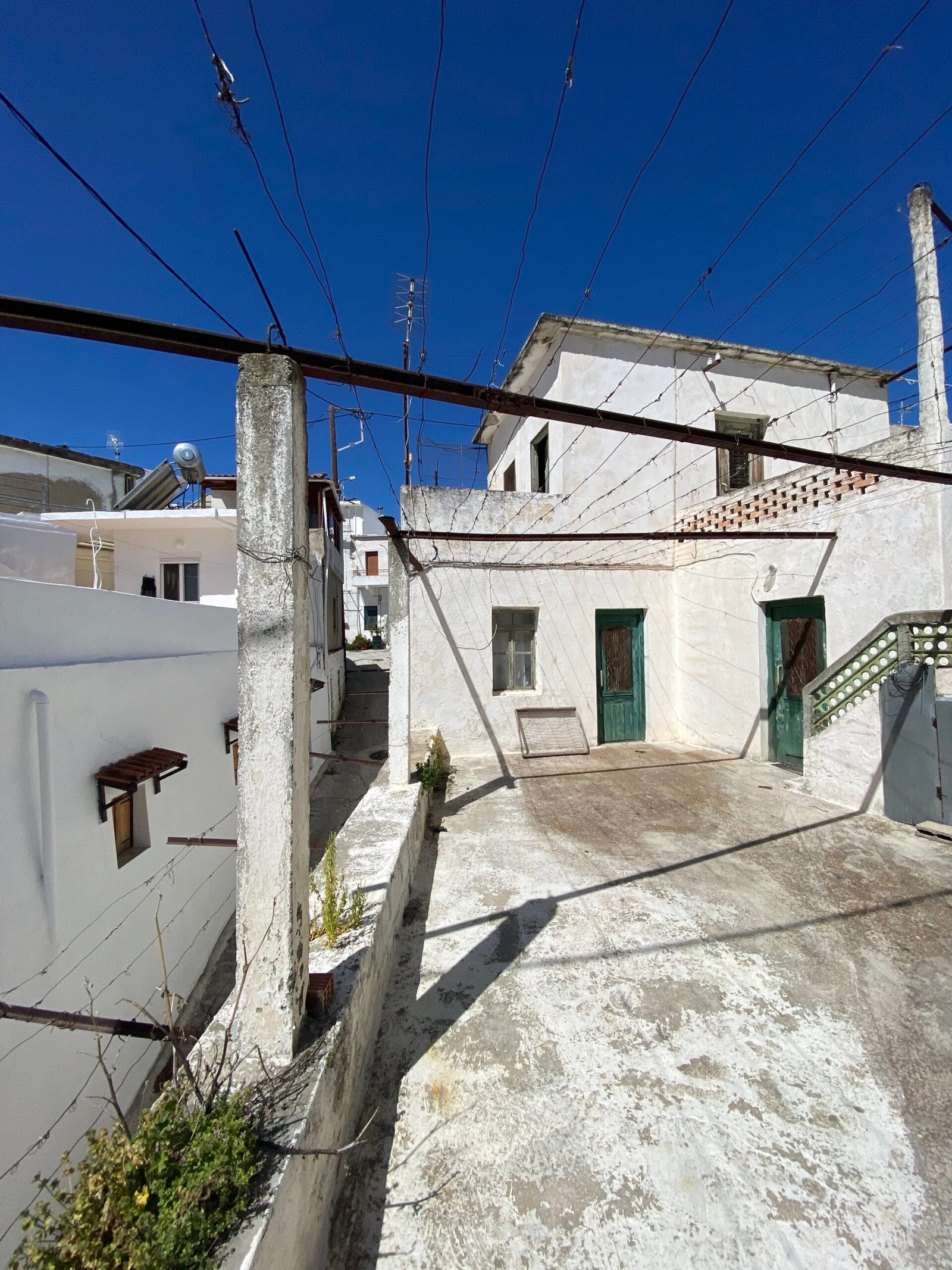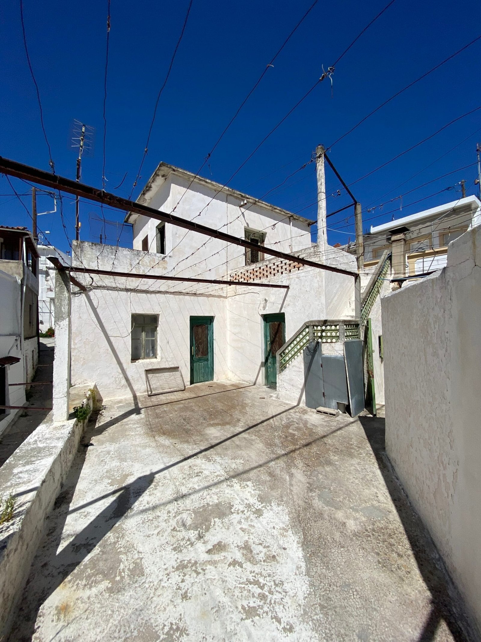 This three-story building is divided into two houses and requires complete renovation. The total area is approximately 100 square meters. Outside, there is a small terrace at the rear facing the village lanes and another at the front access via stairs to the entrance door. The property also features a balcony with a view of the opposite hillside and the surrounding houses.