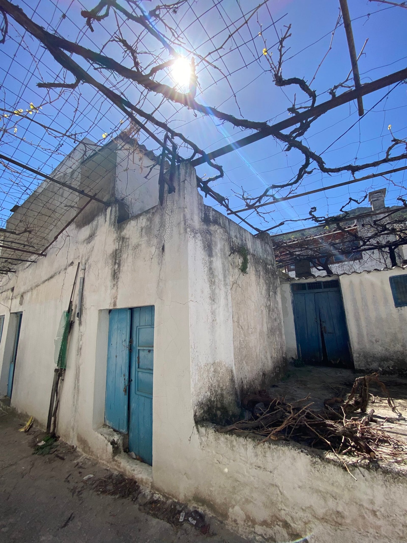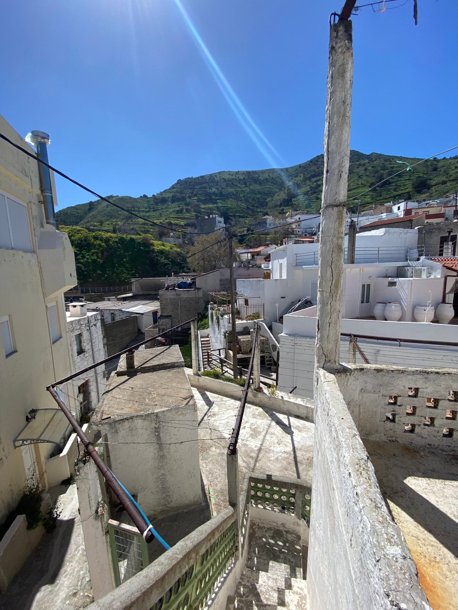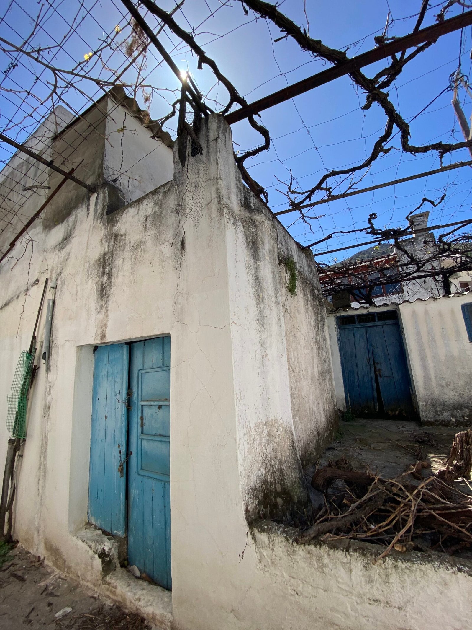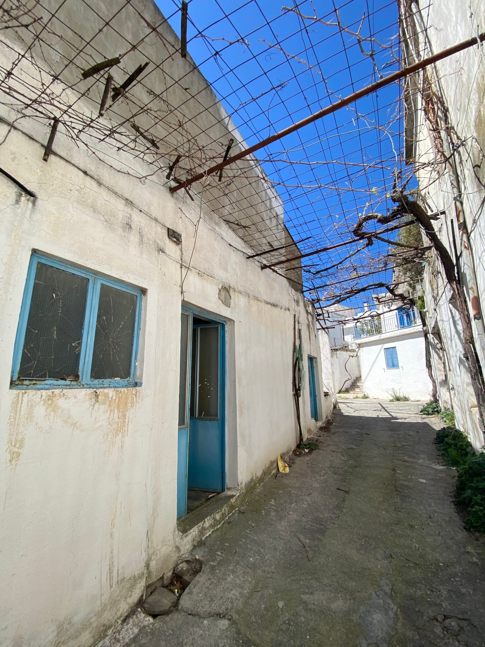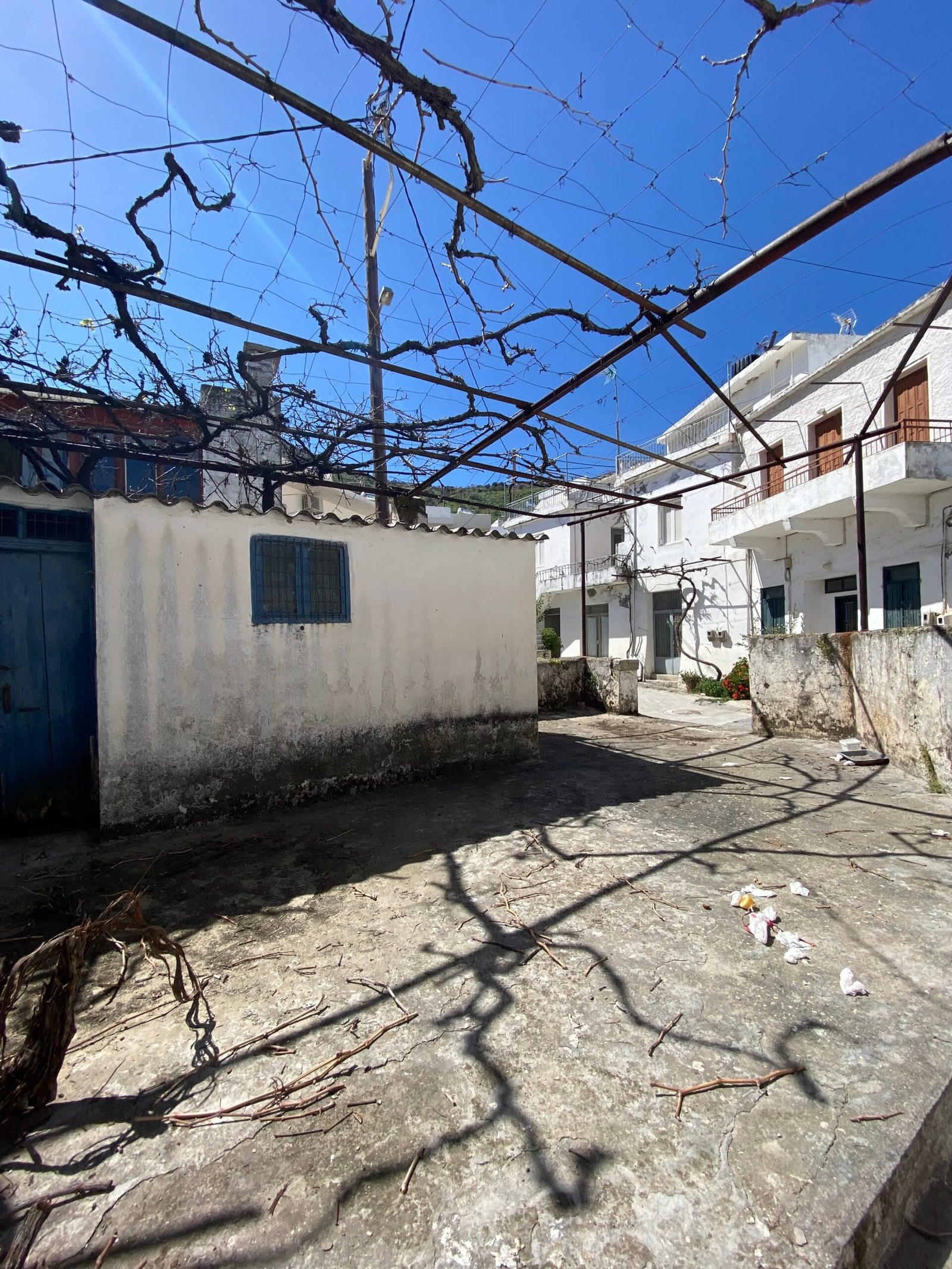 This three-story building is divided into two houses and requires complete renovation. The total area is approximately 100 square meters. Outside, there is a small terrace at the rear facing the village lanes and another at the front access via stairs to the entrance door. The property also features a balcony with a view of the opposite hillside and the surrounding houses.