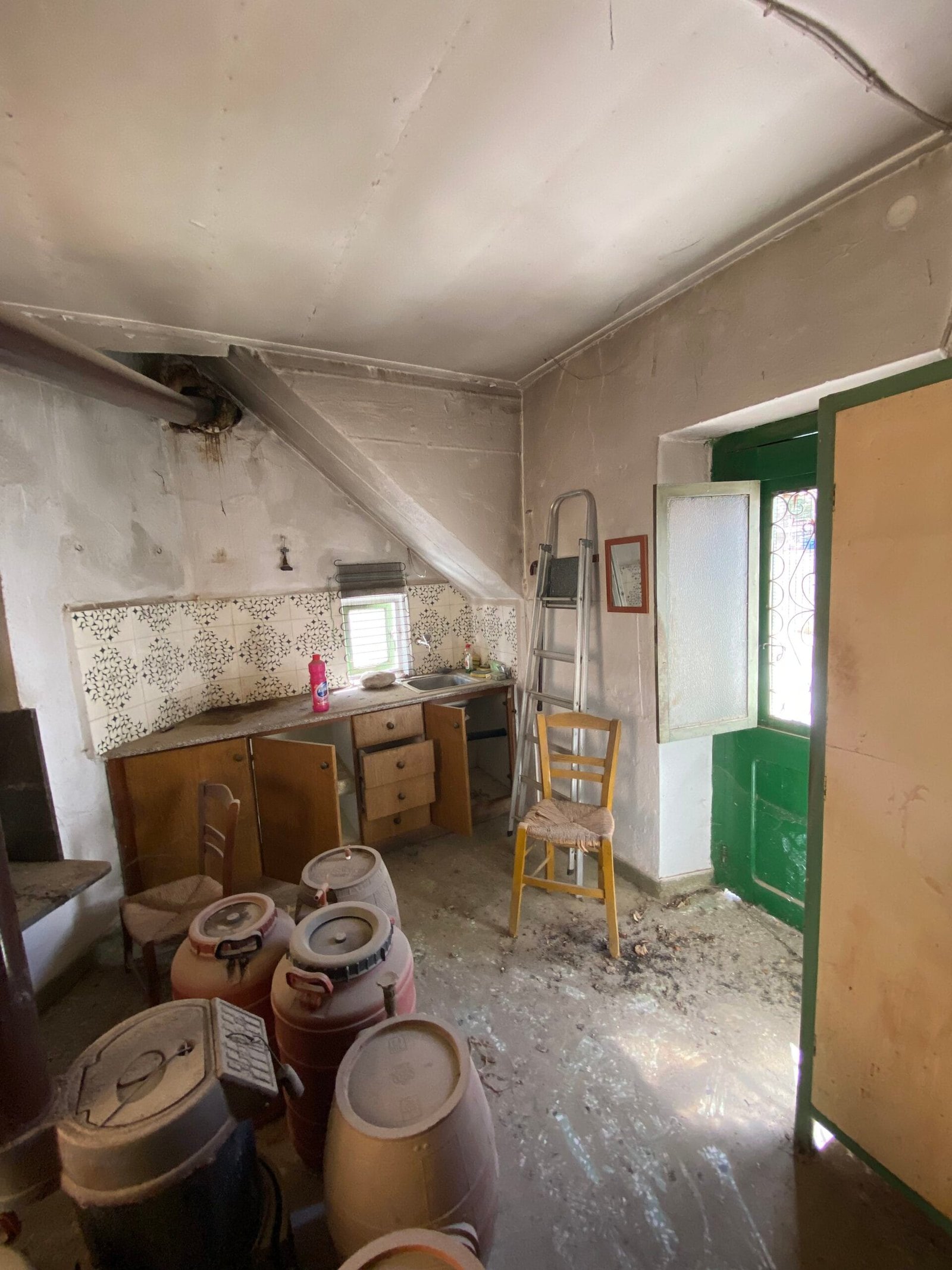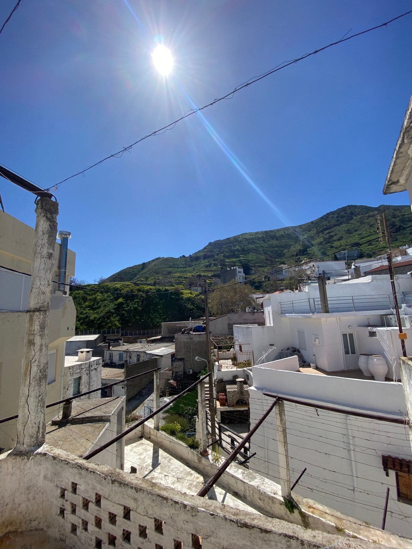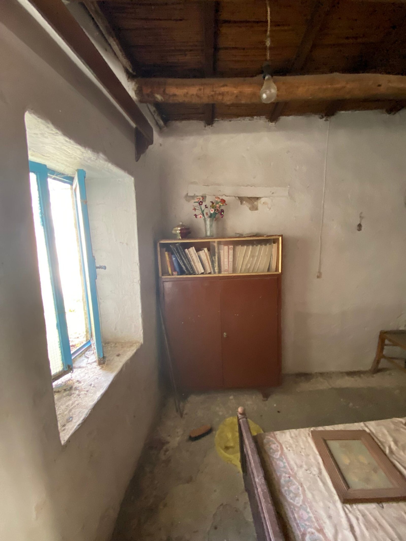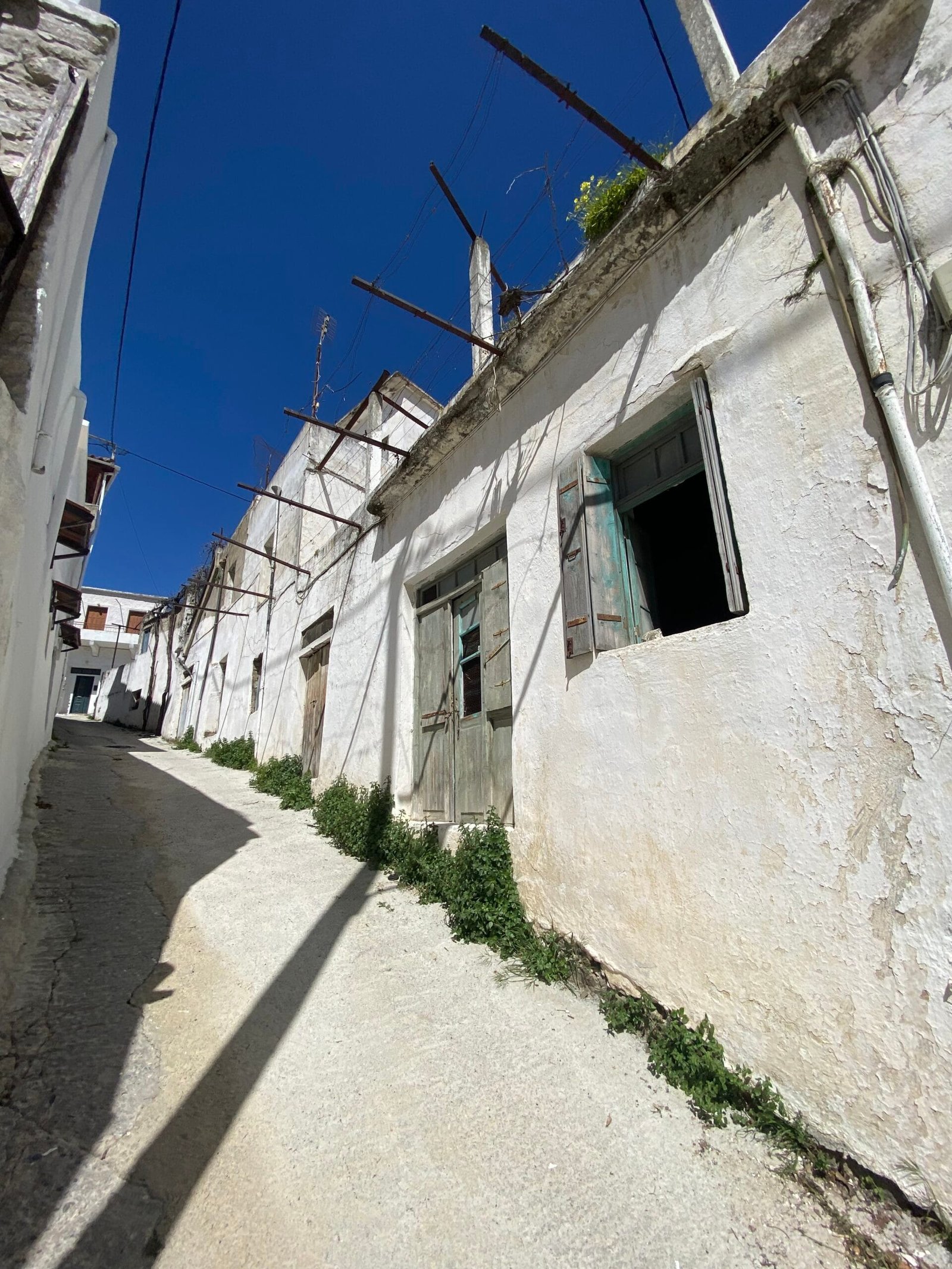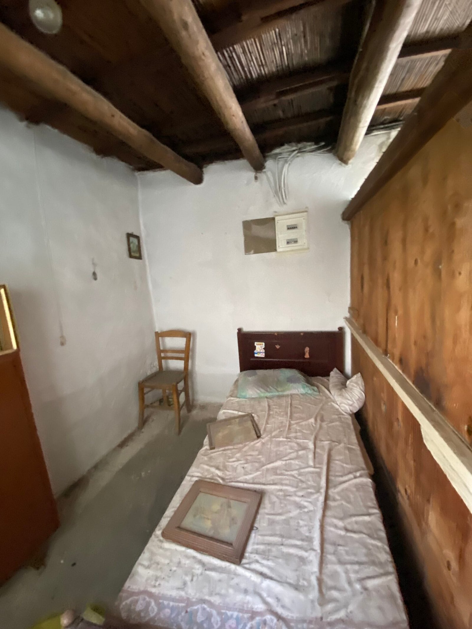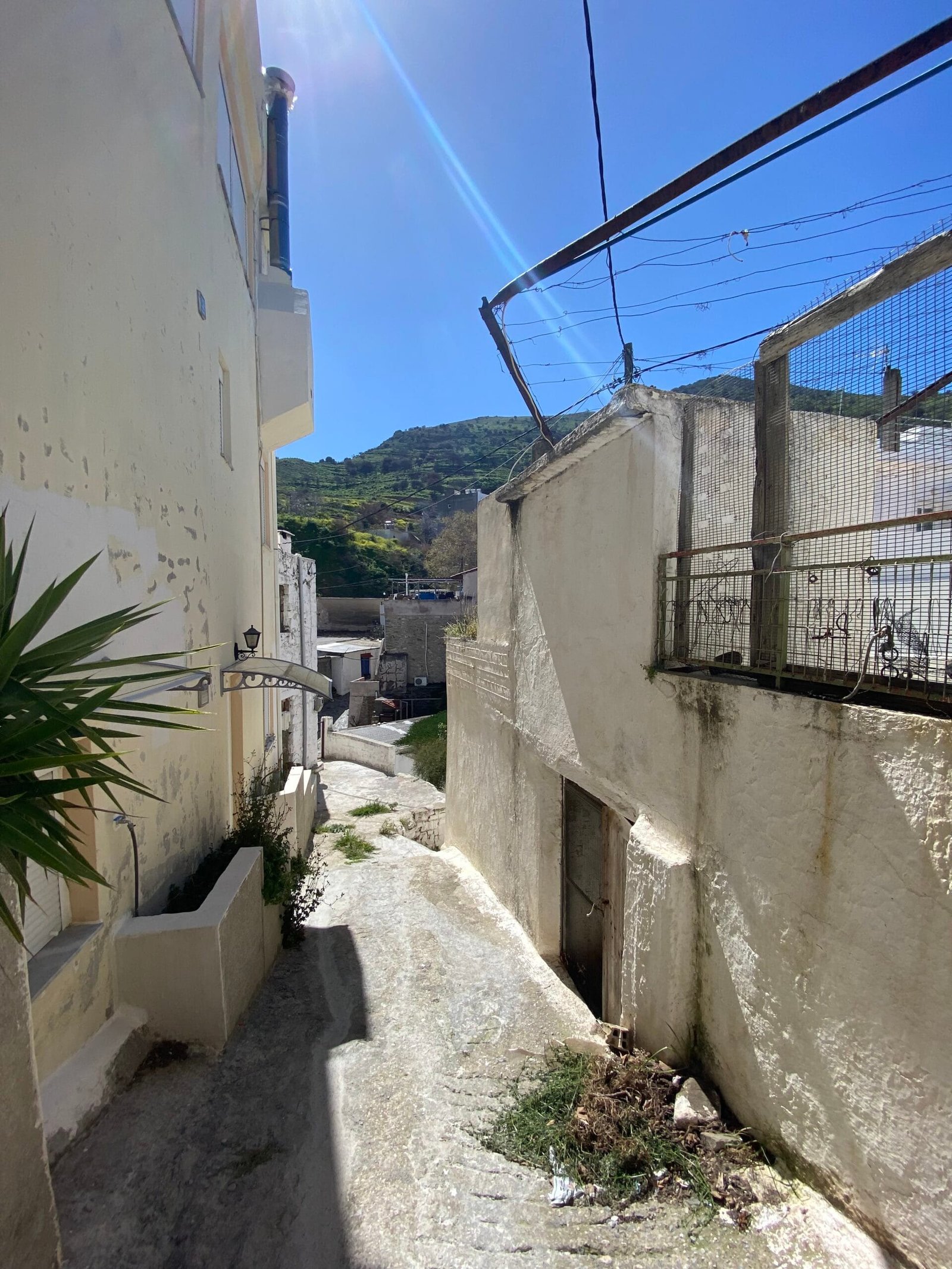 This three-story building is divided into two houses and requires complete renovation. The total area is approximately 100 square meters. Outside, there is a small terrace at the rear facing the village lanes and another at the front access via stairs to the entrance door. The property also features a balcony with a view of the opposite hillside and the surrounding houses.