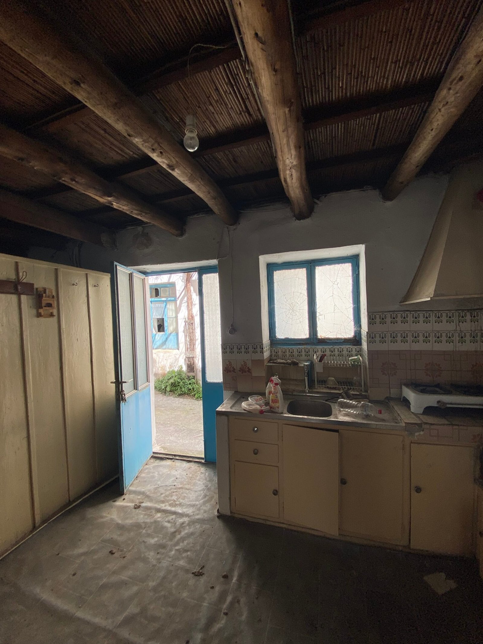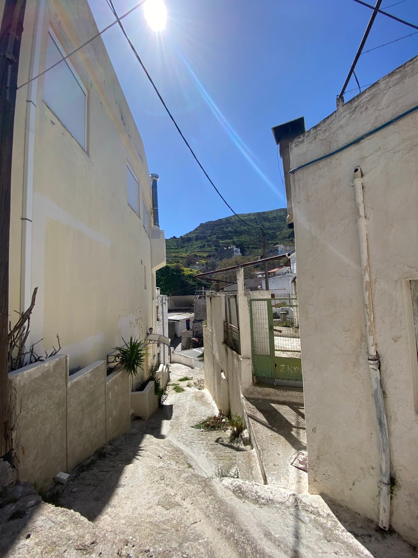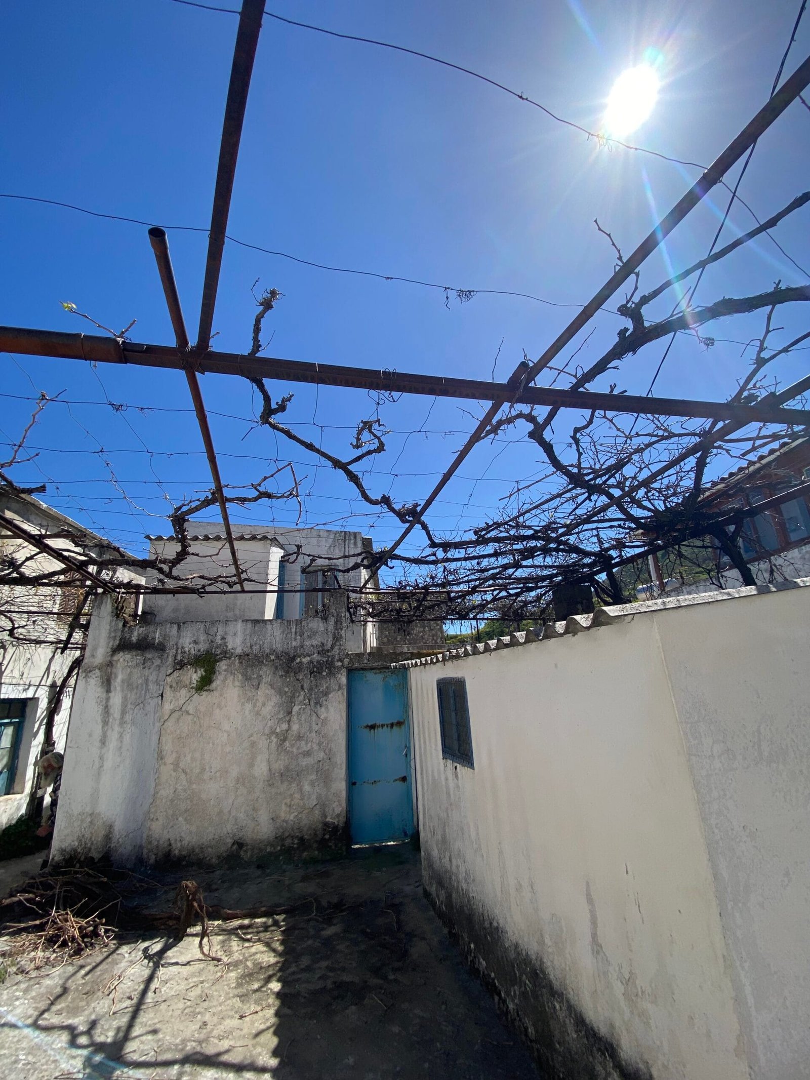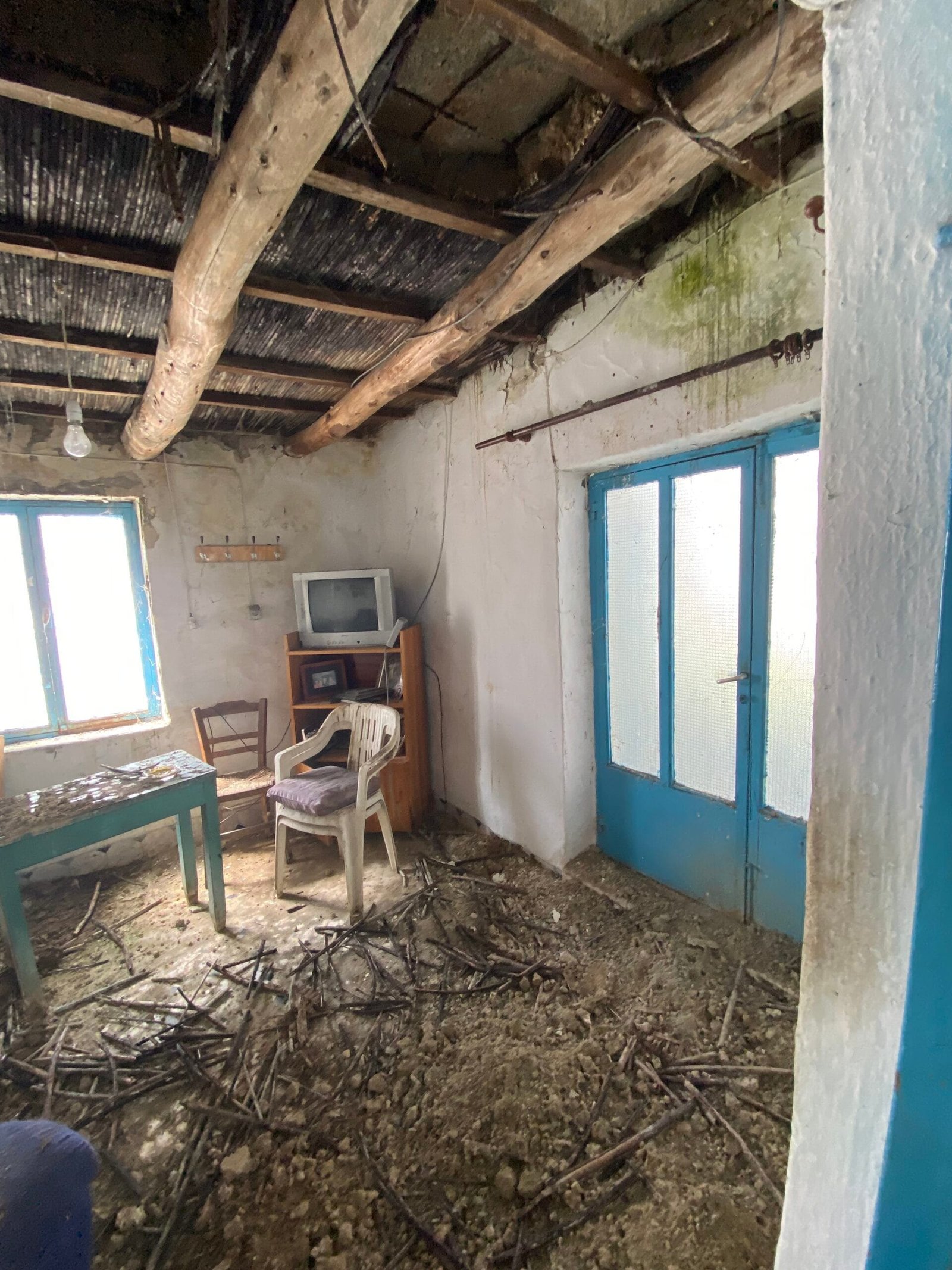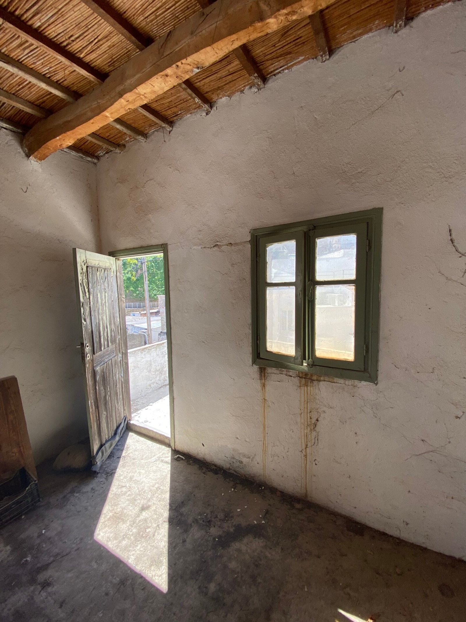 This three-story building is divided into two houses and requires complete renovation. The total area is approximately 100 square meters. Outside, there is a small terrace at the rear facing the village lanes and another at the front access via stairs to the entrance door. The property also features a balcony with a view of the opposite hillside and the surrounding houses.
