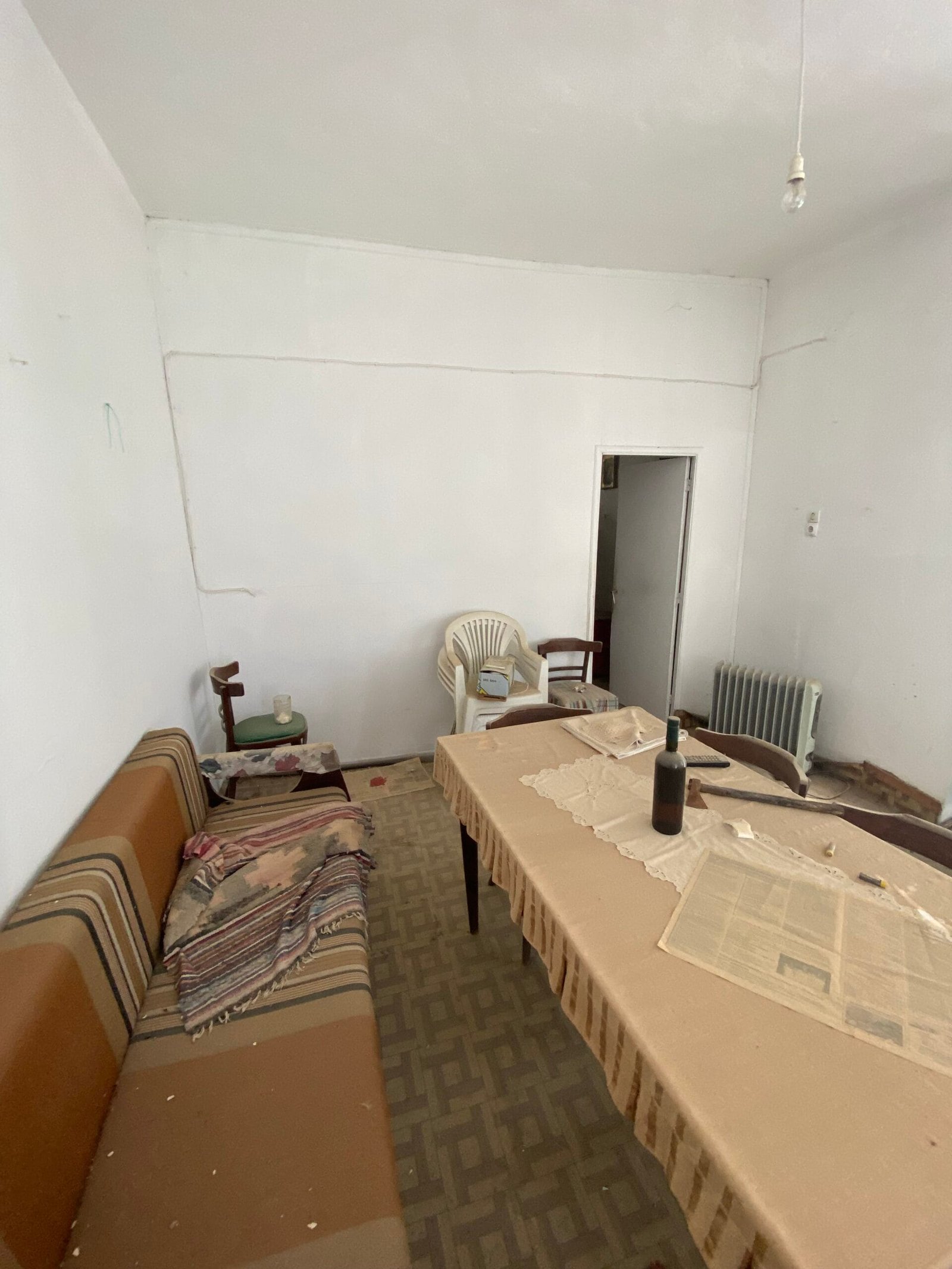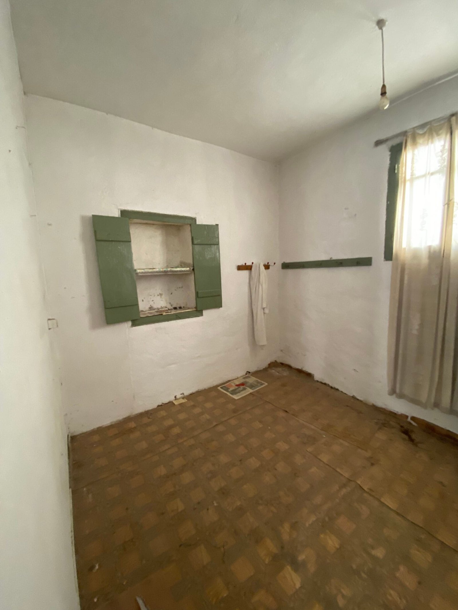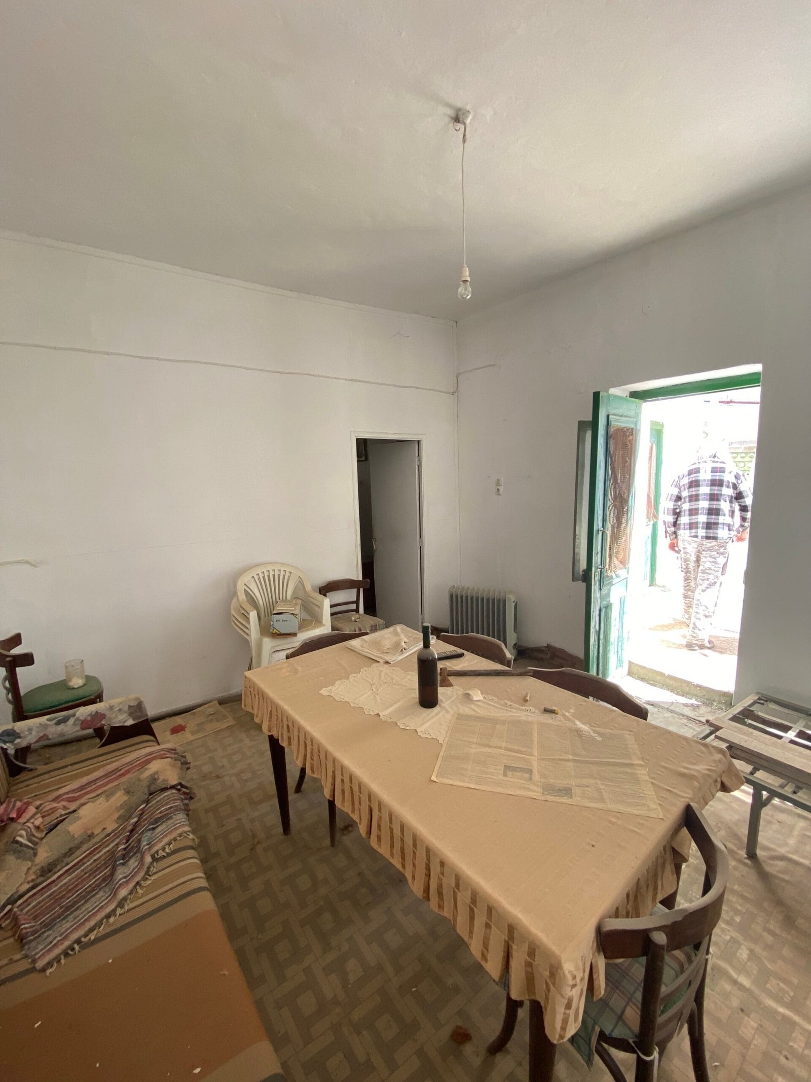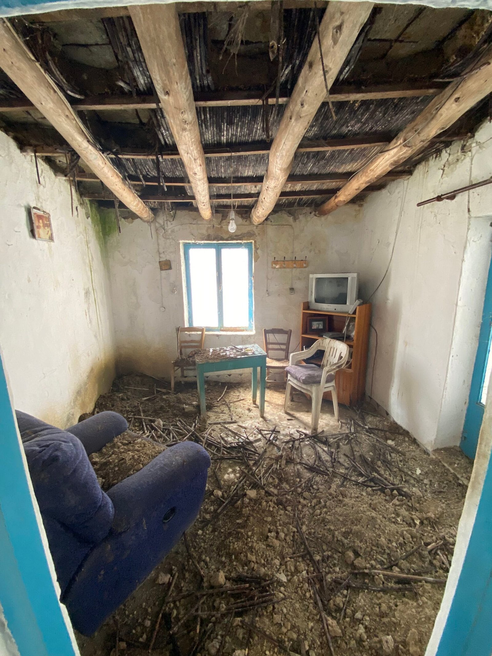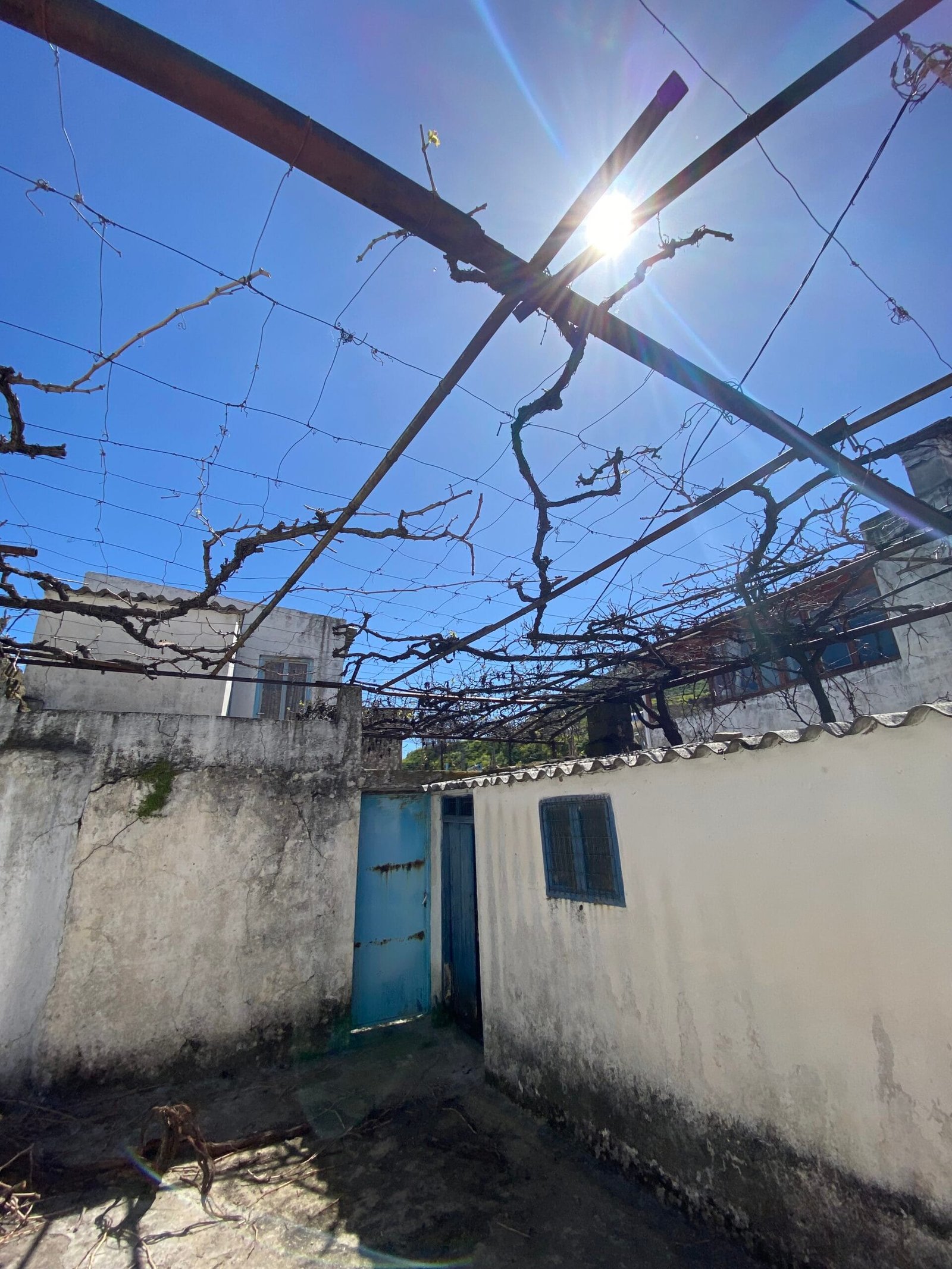 This three-story building is divided into two houses and requires complete renovation. The total area is approximately 100 square meters. Outside, there is a small terrace at the rear facing the village lanes and another at the front access via stairs to the entrance door. The property also features a balcony with a view of the opposite hillside and the surrounding houses.