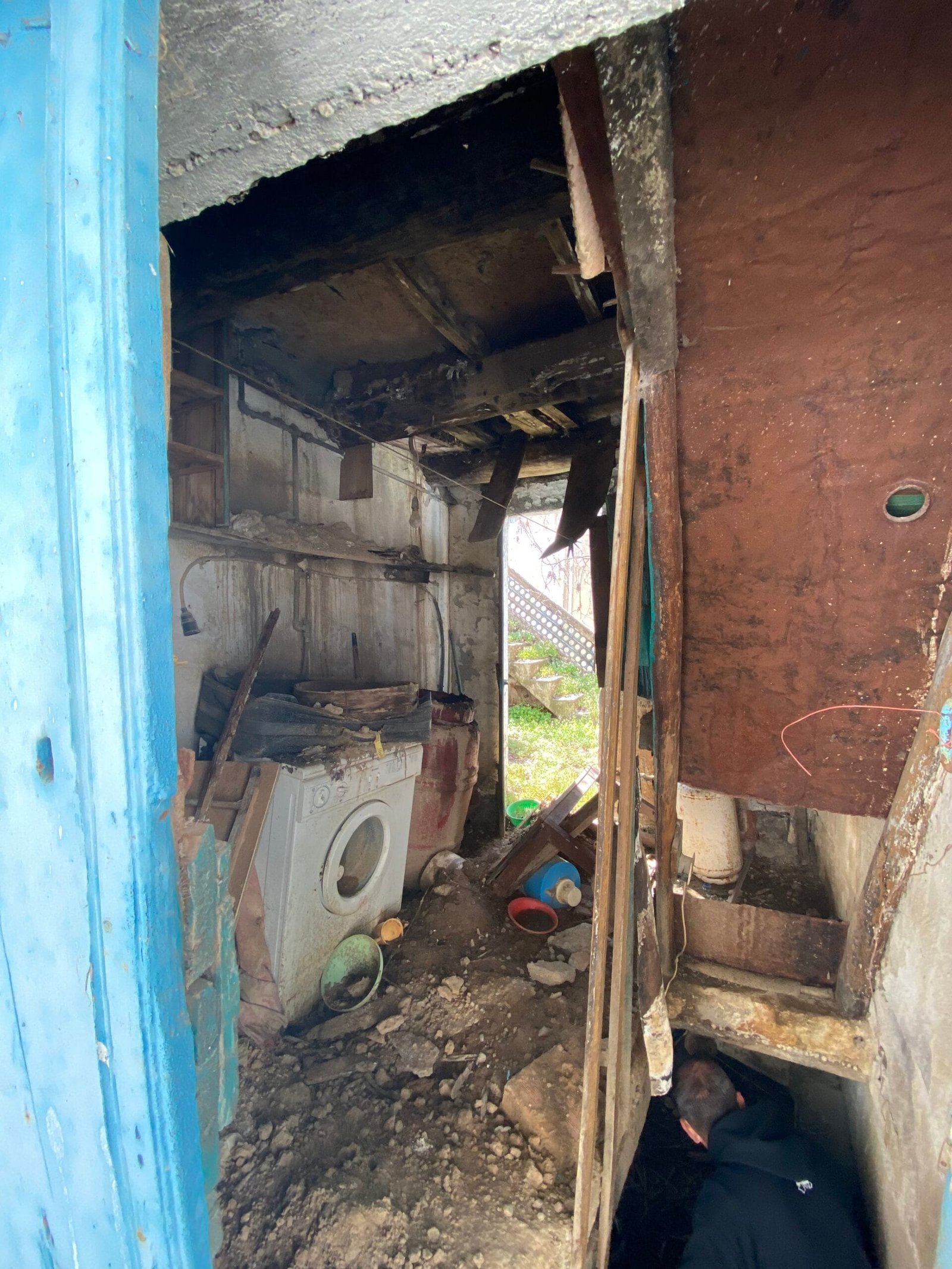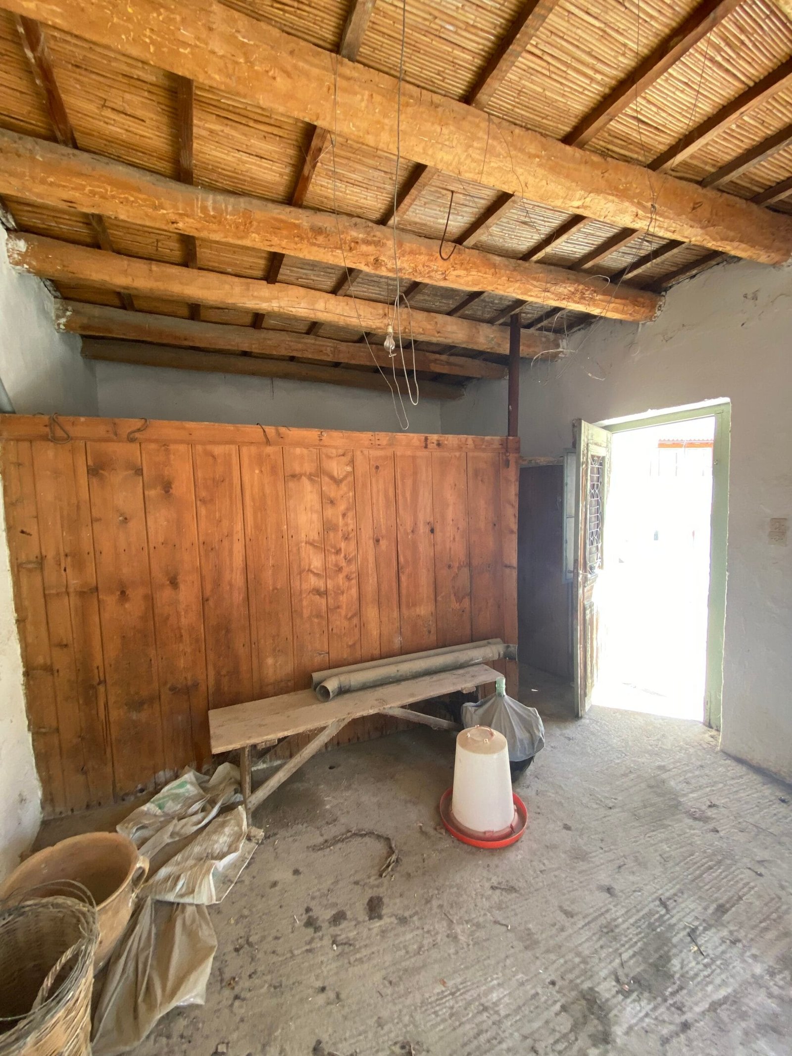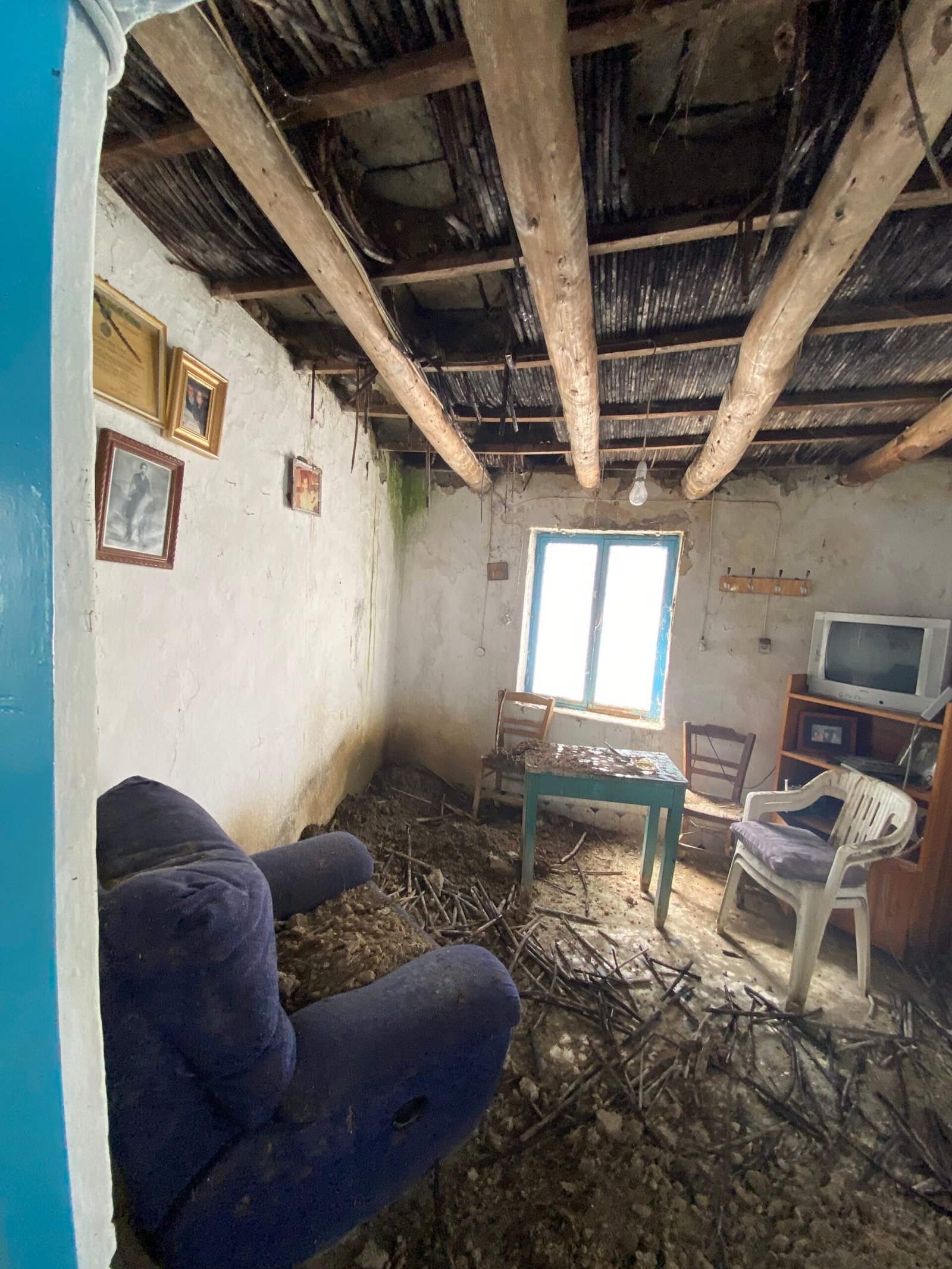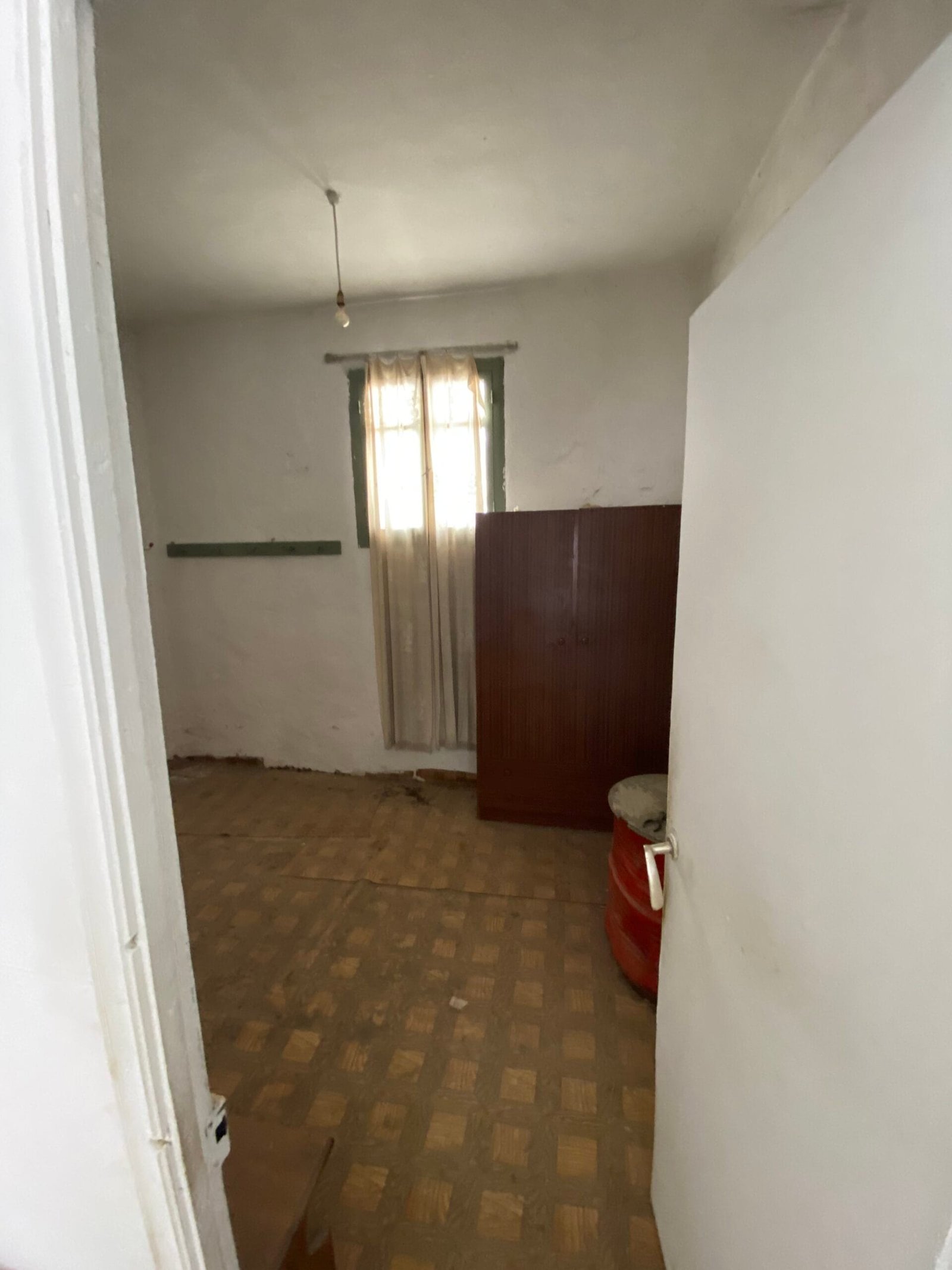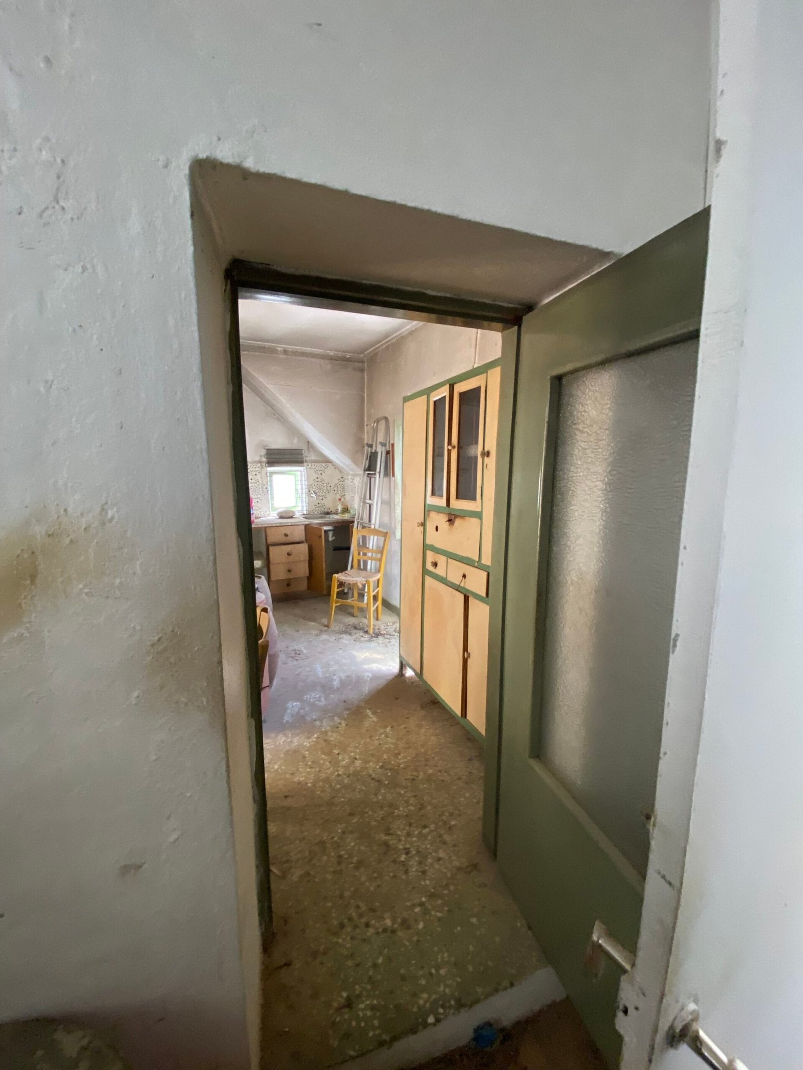 This three-story building is divided into two houses and requires complete renovation. The total area is approximately 100 square meters. Outside, there is a small terrace at the rear facing the village lanes and another at the front access via stairs to the entrance door. The property also features a balcony with a view of the opposite hillside and the surrounding houses.