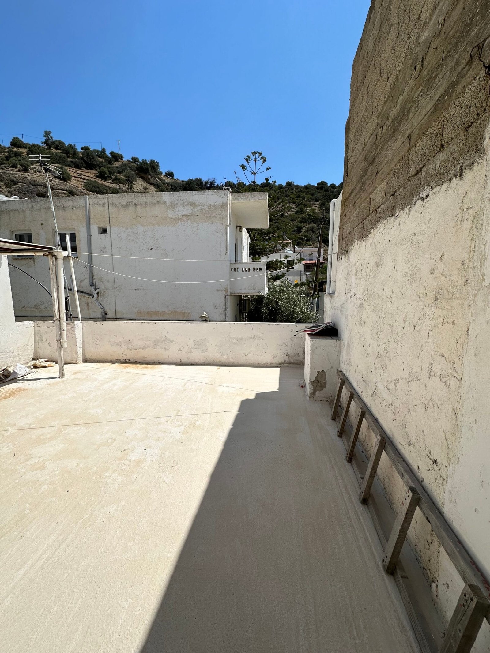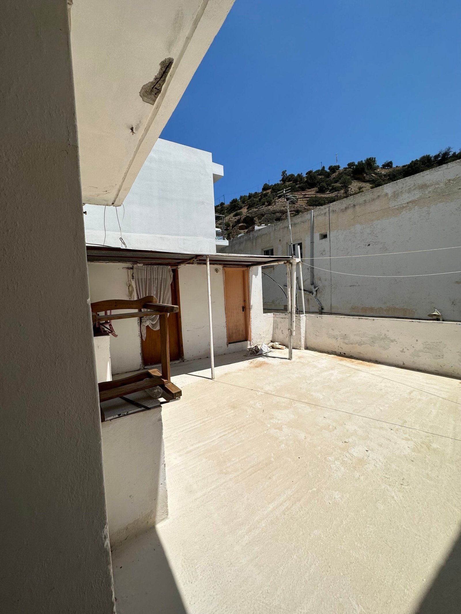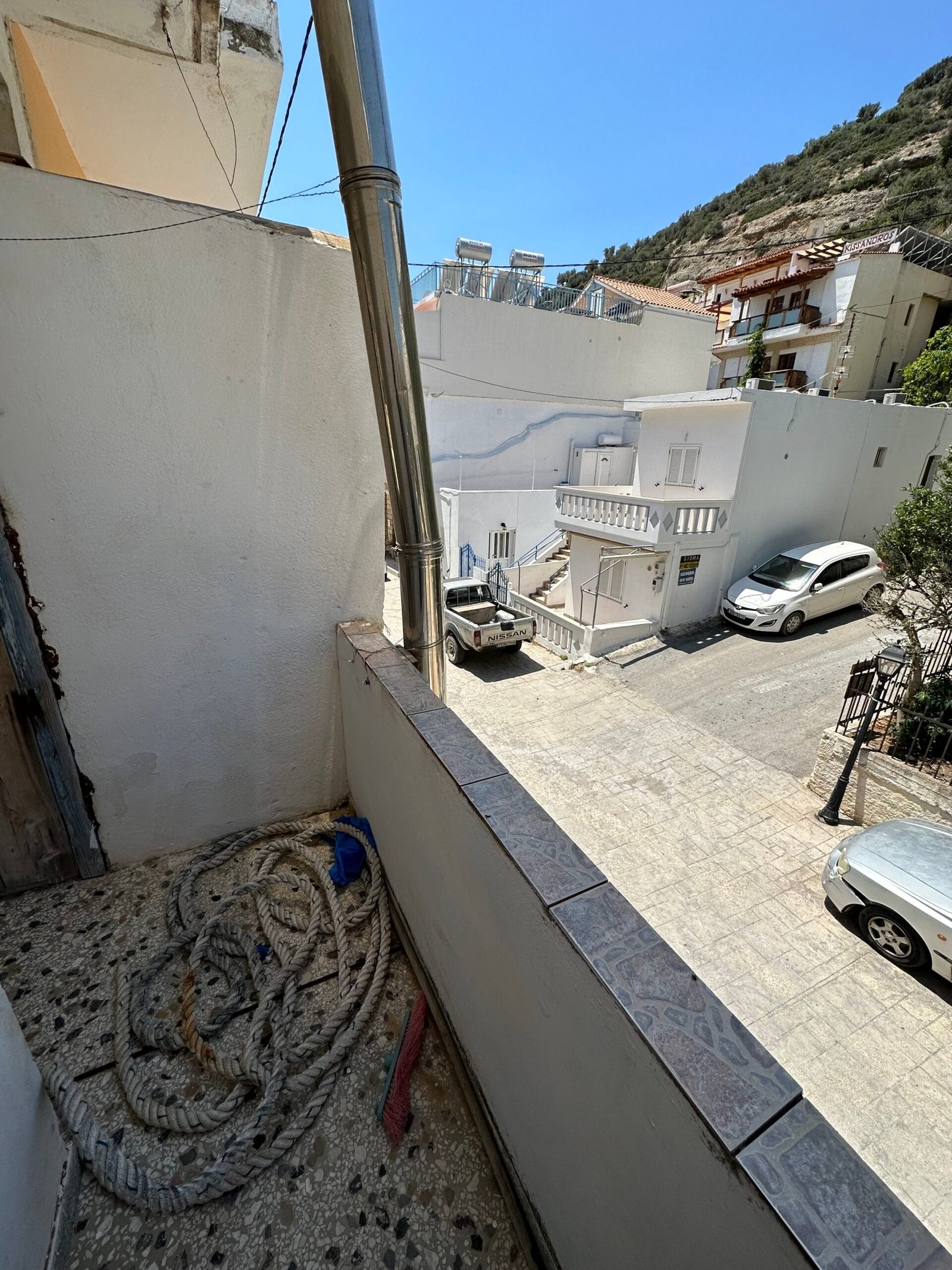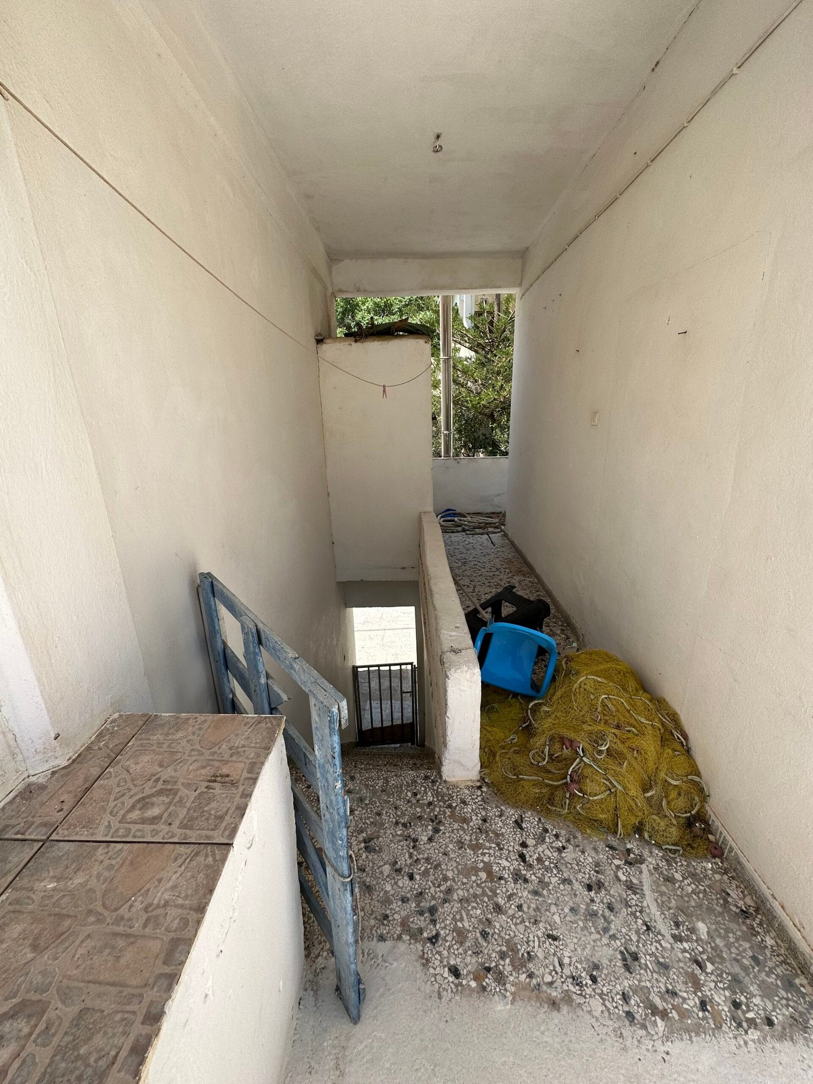 A 100 square meter traditional house, including the exterior, is for sale. It is located on the first floor and has two balconies at the front and back. The house is situated in the peaceful streets of Agia Galini and comprises a living room, a bedroom, and a kitchen. The bathroom is located outside on the spacious back balcony, which can also be used as a patio. The house requires a complete renovation, including the